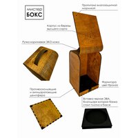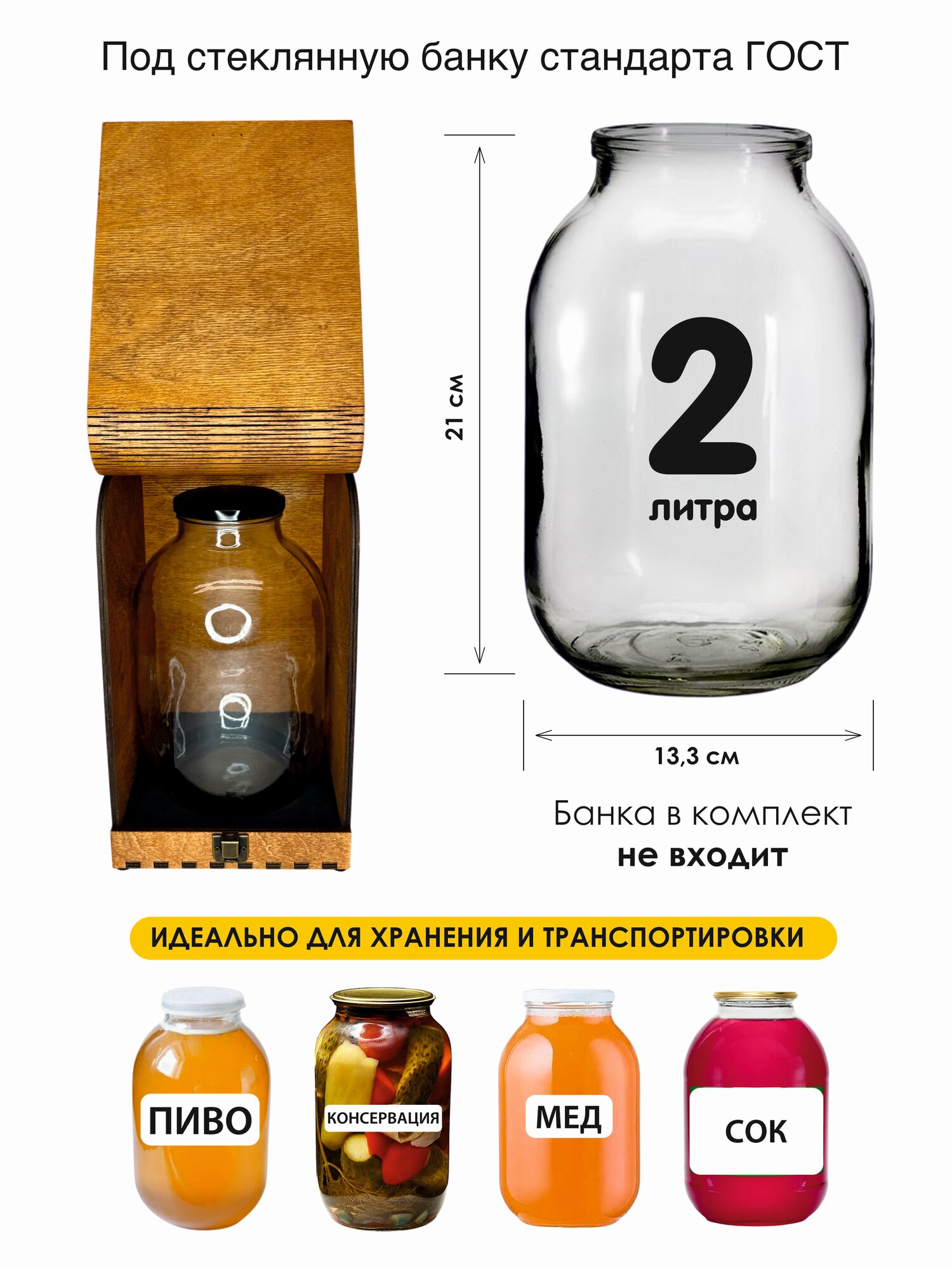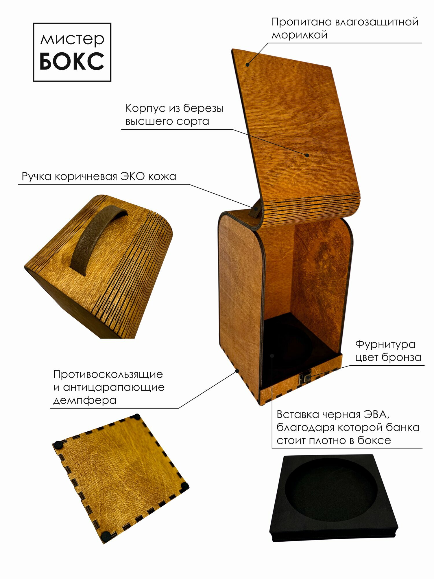 Преимущества бокса: Натуральные материалы – изготовлен из березовой фанеры высшего сорта с тонировкой влагозащитной морилкой. Элегантная фурнитура – ручка из коричневой эко-кожи и замок в цвет бронзы придают благородный вид. Надежная фиксация – внутренняя вставка из ЭВА плотно удерживает банку, предотвращая смещение. Защита и устойчивость – противоскользящие демпферы на дне уберегут поверхности от царапин, а банку – от повреждений. Защита от нагрева – сохраняет напитки прохладными даже на солнце. Удобство транспортировки – крепкая конструкция делает бокс идеальным для перевозки в автомобиле или поездок на природу.