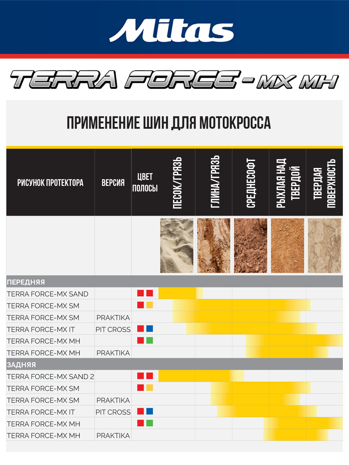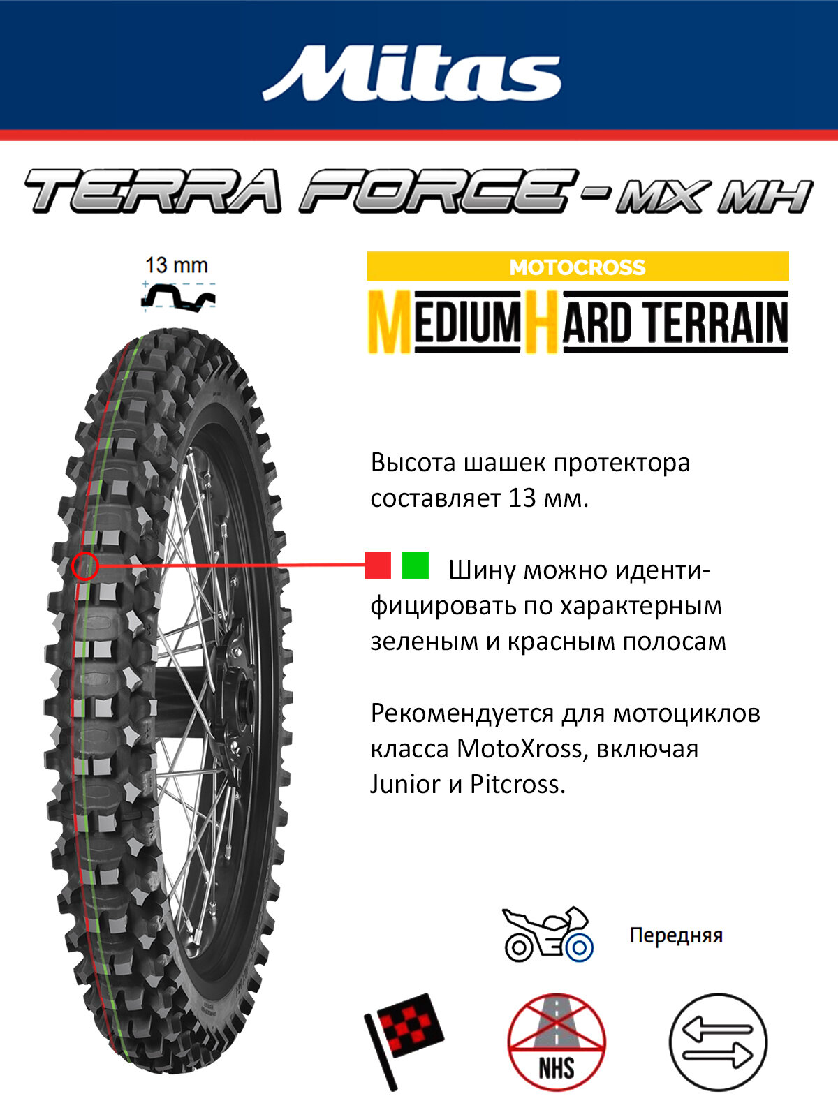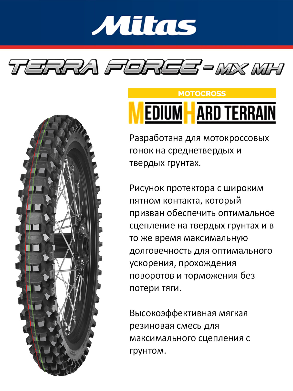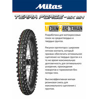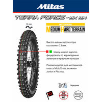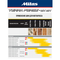 Серия: TERRA FORCE-MX MH -маркируется красной и зелёной полосами. Повышенная частота установки блоков повышает эффективность работы протектора на сыпучих каменистых поверхностях. Мягкий каркас и резиновая смесь обеспечивают мягкость хода и комфортное управление на мелких неровностях. Парное расположение блоков в центральной части позволяет более интенсивно ускоряться и тормозить.