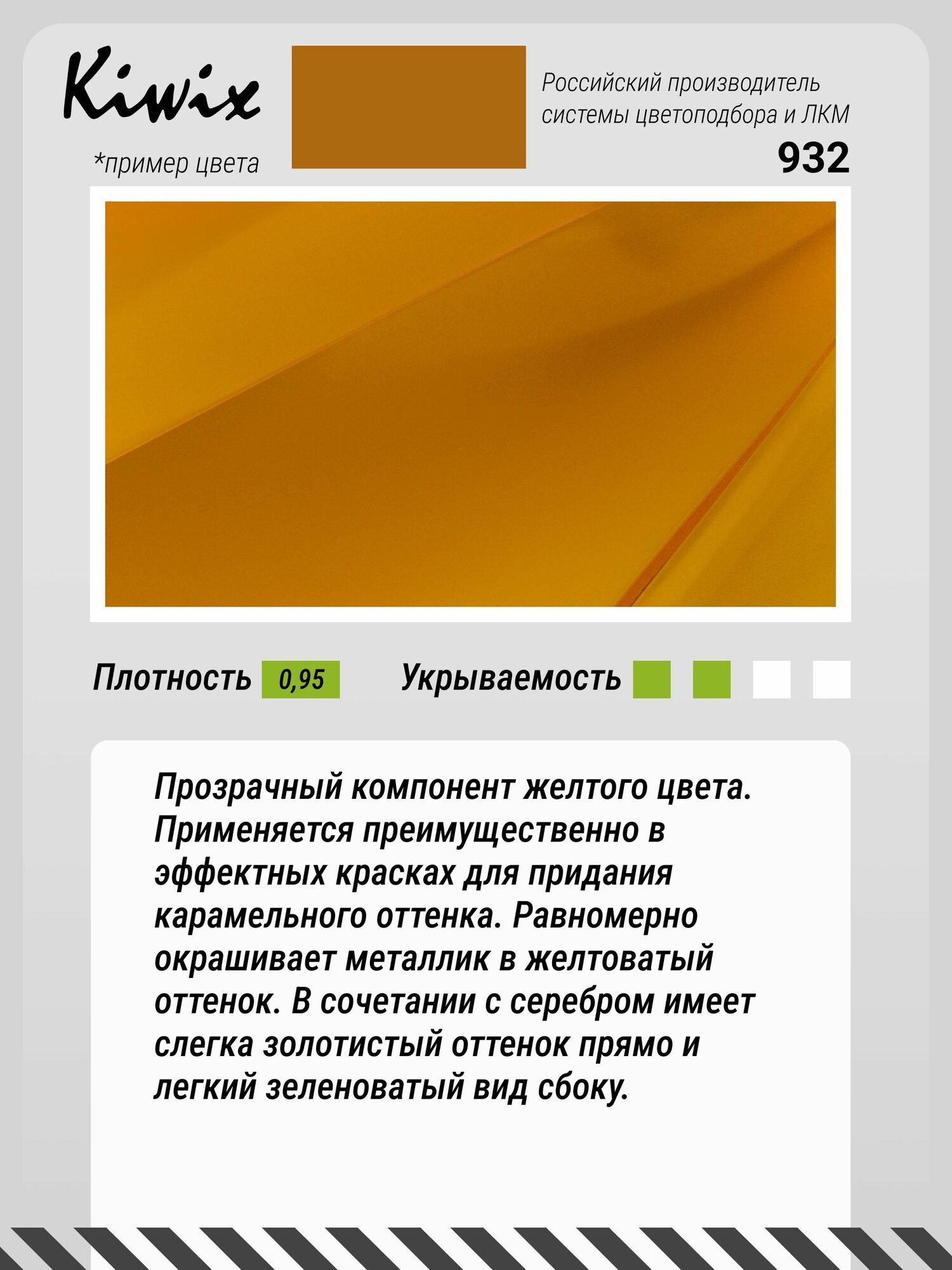 Прозрачный компонент желтого цвета. Применяется преимущественно в эффектных красках для придания карамельного оттенка. Равномерно окрашивает металлик в желтоватый оттенок. В сочетании с серебром имеет слегка золотистый оттенок прямо и легкий зеленоватый вид сбоку. Плотность 0.95