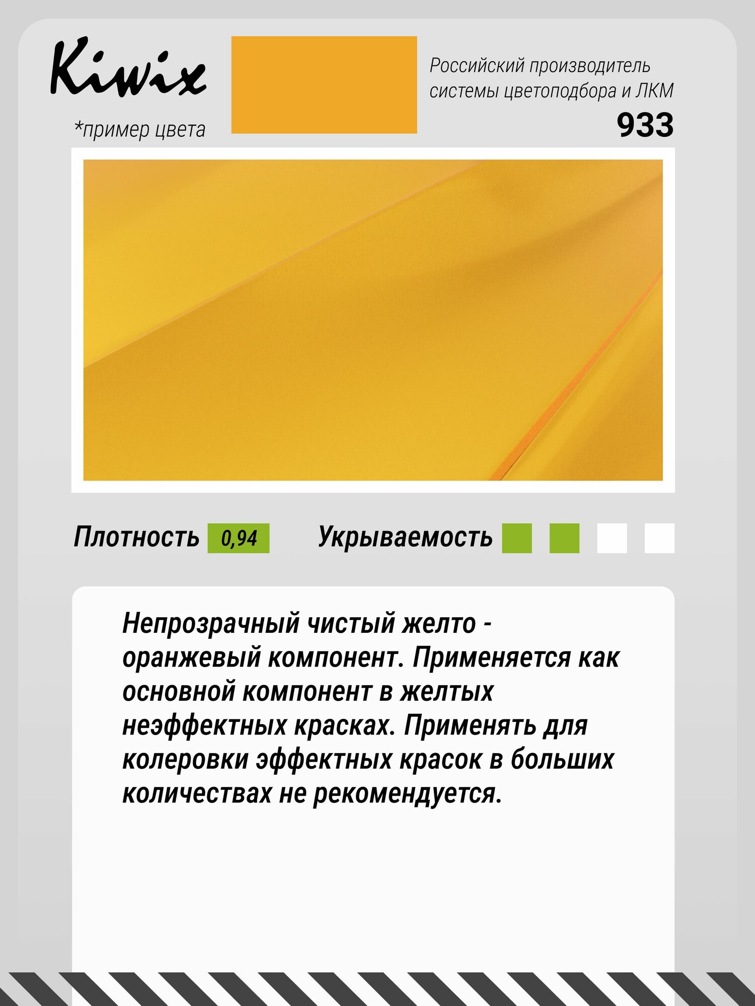 Непрозрачный чистый желто - оранжевый компонент. Применяется как основной компонент в желтых неэффектных красках. Применять для колеровки эффектных красок в больших количествах не рекомендуется. Плотность 0.94