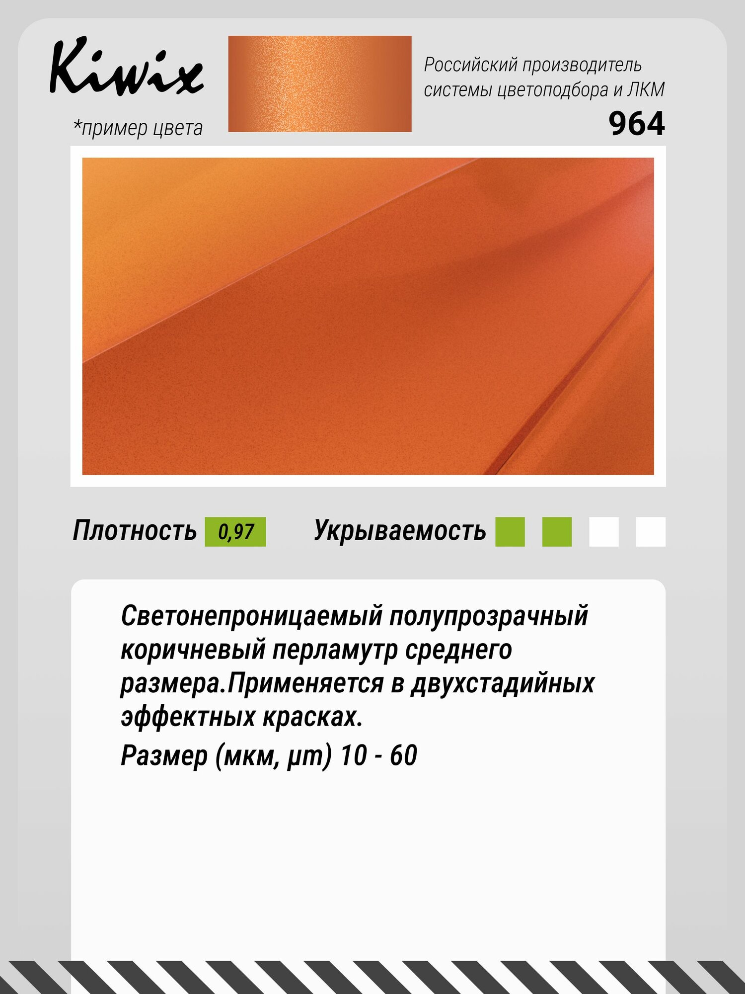 Светонепроницаемый полупрозрачный коричневый перламутр среднего размера. Применяется в двухстадийных эффектных красках. Размер (мкм, µm) 10 - 60 Плотность 0.97