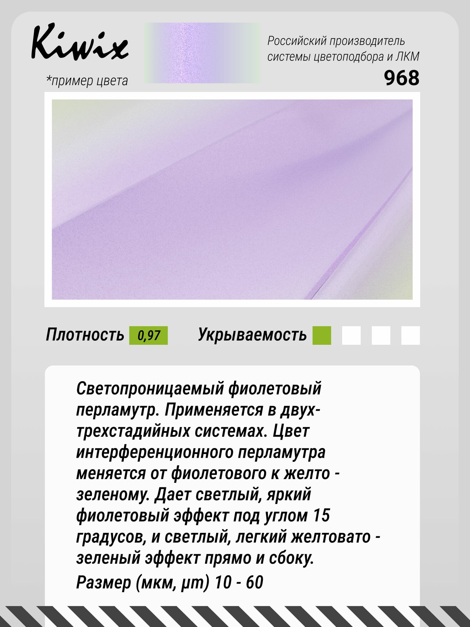 Светопроницаемый фиолетовый перламутр. Применяется в двух-трехстадийных системах. Цвет интерференционного перламутра меняется от фиолетового к желто -зеленому. Дает светлый, яркий фиолетовый эффект под углом 15 градусов, и светлый, легкий желтовато - зеленый эффект прямо и сбоку. Размер (мкм, µm) 10 - 60 Плотность 0.97