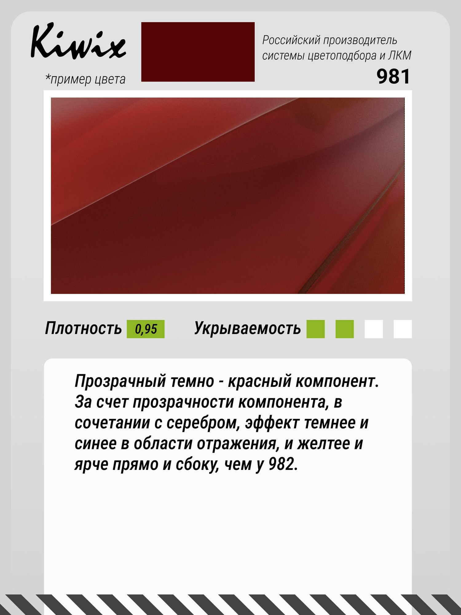 Прозрачный темно - красный компонент. За счет прозрачности компонента, в сочетании с серебром, эффект темнее и синее в области отражения, и желтее и ярче прямо и сбоку, чем у 982. Плотность 0.95