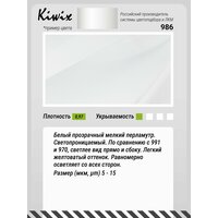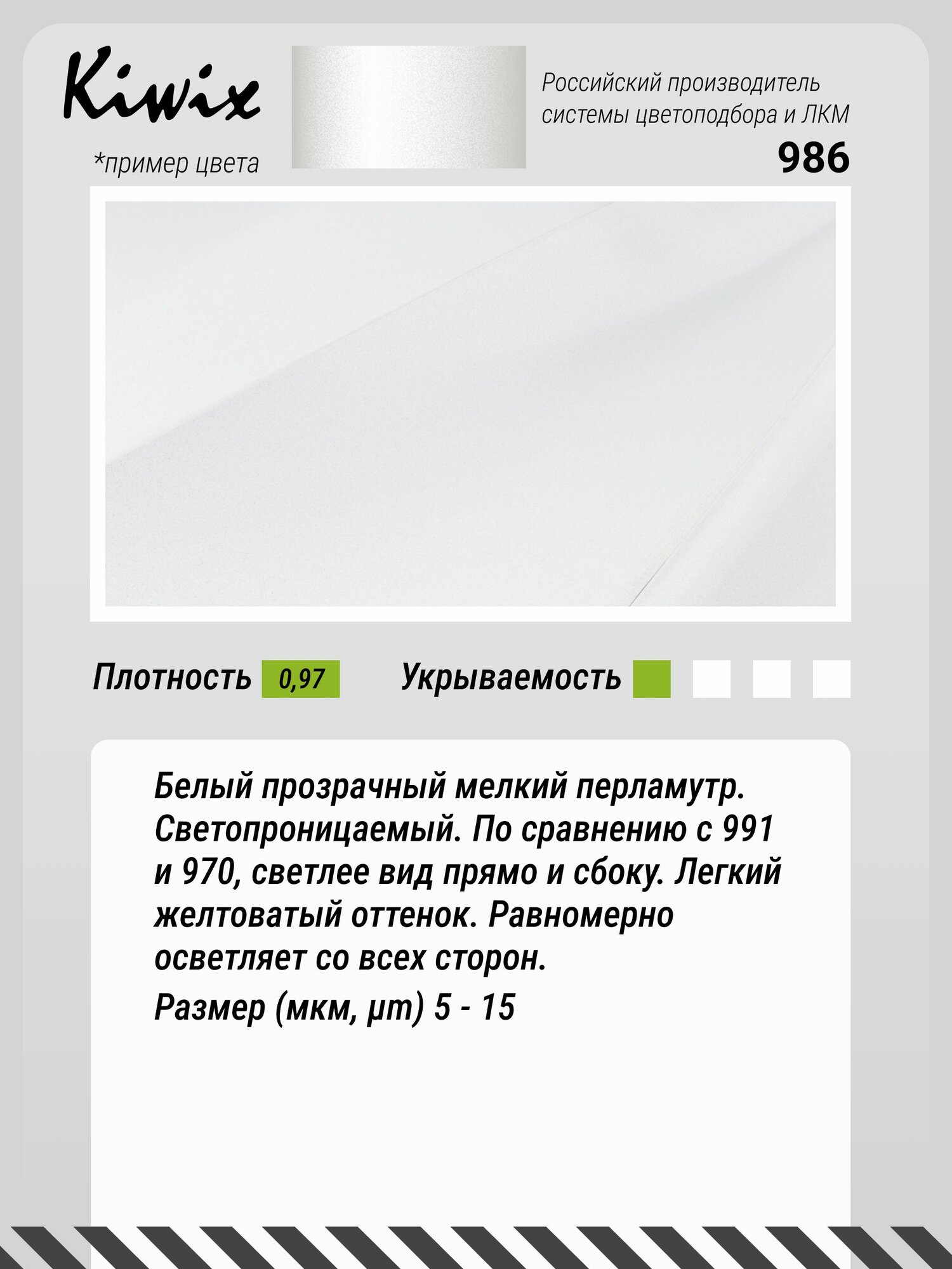 Белый прозрачный мелкий перламутр. Светопроницаемый. По сравнению с 991 и 970, светлее вид прямо и сбоку. Легкий желтоватый оттенок. Равномерно осветляет со всех сторон. Размер (мкм, µm) 5 - 15 Плотность 0.97