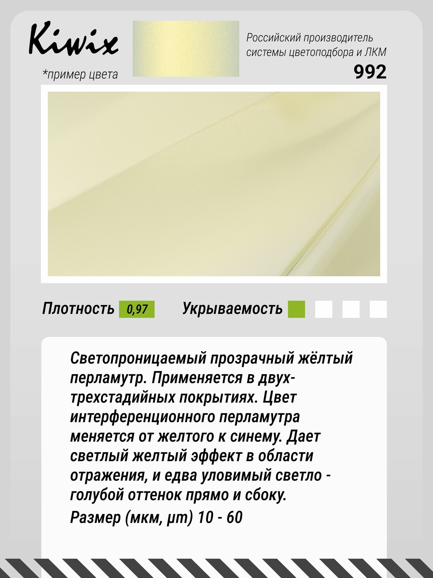 Светопроницаемый прозрачный жёлтый перламутр. Применяется в двух-трехстадийных покрытиях. Цвет интерференционного перламутра меняется от желтого к синему. Дает светлый желтый эффект в области отражения, и едва уловимый светло - голубой оттенок прямо и сбоку. Размер (мкм, µm) 10 - 60 Плотность 0.97