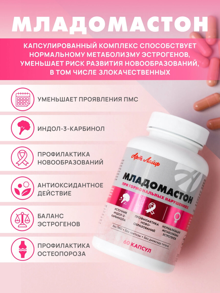 Купить Младомастон Арт Лайф, в комплексной терапии мастопатии, эндометриоза, уменьшение риска развития новообразований, 60 шт. с доставкой по всей России. Младомастон Арт Лайф, в комплексной терапии мастопатии, эндометриоза, уменьшение риска развития новообразований, 60 шт.: сравнение цен, характеристики, фото, актуальное наличие и цены.