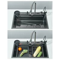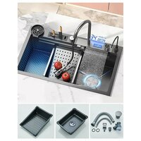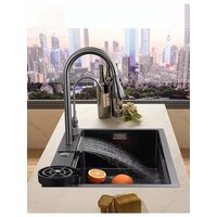 Умная раковина изготовлена из нержавеющей стали, которая отличается прочностью и устойчивостью к повреждениям и коррозии. Раковина имеет стильный и изящный дизайн, который позволяет расширить пространство и сделать его более изысканным и сдержанным. Раковина оснащена функцией водопада, и есть два разных потока воды - большой и малый, которые можно переключать с помощью кнопок. Устройство контроля температуры со встроенным экраном и смесителем с постоянной температурой обеспечивает комфортную эксплуатацию мойки. Удобный смеситель выдвигается на 60 см и вращается на 360 градусов, что значительно облегчает процесс стирки. Наши уникальные кухонные принадлежности оснащены встроенным краном, фильтром для питьевой воды, устройством для промывки стекла и дозатором мыла, которые полностью функциональны, удобны и полностью вписываются в общий дизайн вашей кухни.