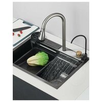Мы предлагаем вам многофункциональную кухонную стальную раковину - идеальное решение для кухонного пространства. Умная раковина изготовлена из нержавеющей стали, которая отличается прочностью и устойчивостью к повреждениям и коррозии. Антибактериальное нанопокрытие и врезная конструкция обеспечивают легкую очистку. Он легко моется и не впитывает запахи, что делает его очень подходящим для использования на кухне. Раковина имеет стильный и изящный дизайн, который позволяет расширить пространство и сделать его более изысканным и сдержанным.