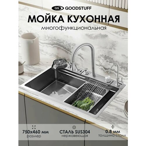 Многофункциональная мойка для кухни GoodStuff - это идеальное решение для современной кухни. Она выполнена из прочной нержавеющей стали, что гарантирует ей долгий срок службы и защиту от коррозии. Мойка черная harmony black придает ей элегантный и стильный вид, который будет органично вписываться в любой интерьер. Эта мойка для кухни врезная, что позволяет ее удобно и компактно разместить в кухонном столе. Благодаря своим размерам она может быть установлена даже в небольших кухнях. Мойка GoodStuff обладает множеством функций, которые значительно упрощают процесс мытья посуды. Её большая ёмкость позволяет мыть большие предметы, такие как кастрюли или блюда. Кроме того, мойка оснащена контейнером для посуды со сливом, контейнером для фруктов и овощей, разделочной доской ; смеситель выдвижной с каскадным режимом и водопадом; мойка для стаканов; кран для фильтрованной воды и монтажный комплектом В целом, мойка для кухни GoodStuff - это практичный и надежный помощник в бытовых делах, который поможет вам экономить время и силы на мытье посуды. Мойка из нержавеющей стали SUS-304; Цвет - черный 750*460*220мм, толщина 0.8 мм