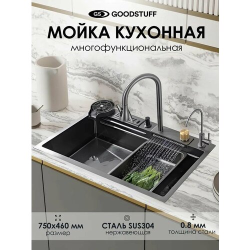 Многофункциональная мойка для кухни GoodStuff - это идеальное решение для современной кухни. Она выполнена из прочной нержавеющей стали, что гарантирует ей долгий срок службы и защиту от коррозии. Мойка черная harmony black придает ей элегантный и стильный вид, который будет органично вписываться в любой интерьер. Эта мойка для кухни врезная, что позволяет ее удобно и компактно разместить в кухонном столе. Благодаря своим размерам она может быть установлена даже в небольших кухнях. Мойка GoodStuff обладает множеством функций, которые значительно упрощают процесс мытья посуды. Её большая ёмкость позволяет мыть большие предметы, такие как кастрюли или блюда. Кроме того, мойка оснащена контейнером для посуды со сливом, контейнером для фруктов и овощей, разделочной доской ; смеситель выдвижной с каскадным режимом и водопадом; мойка для стаканов; кран для фильтрованной воды и монтажный комплектом В целом, мойка для кухни GoodStuff- это практичный и надежный помощник в бытовых делах, который поможет вам экономить время и силы на мытье посуды. Мойка из нержавеющей стали SUS-304; Цвет - черный 750*460*220мм, толщина 0.8 мм