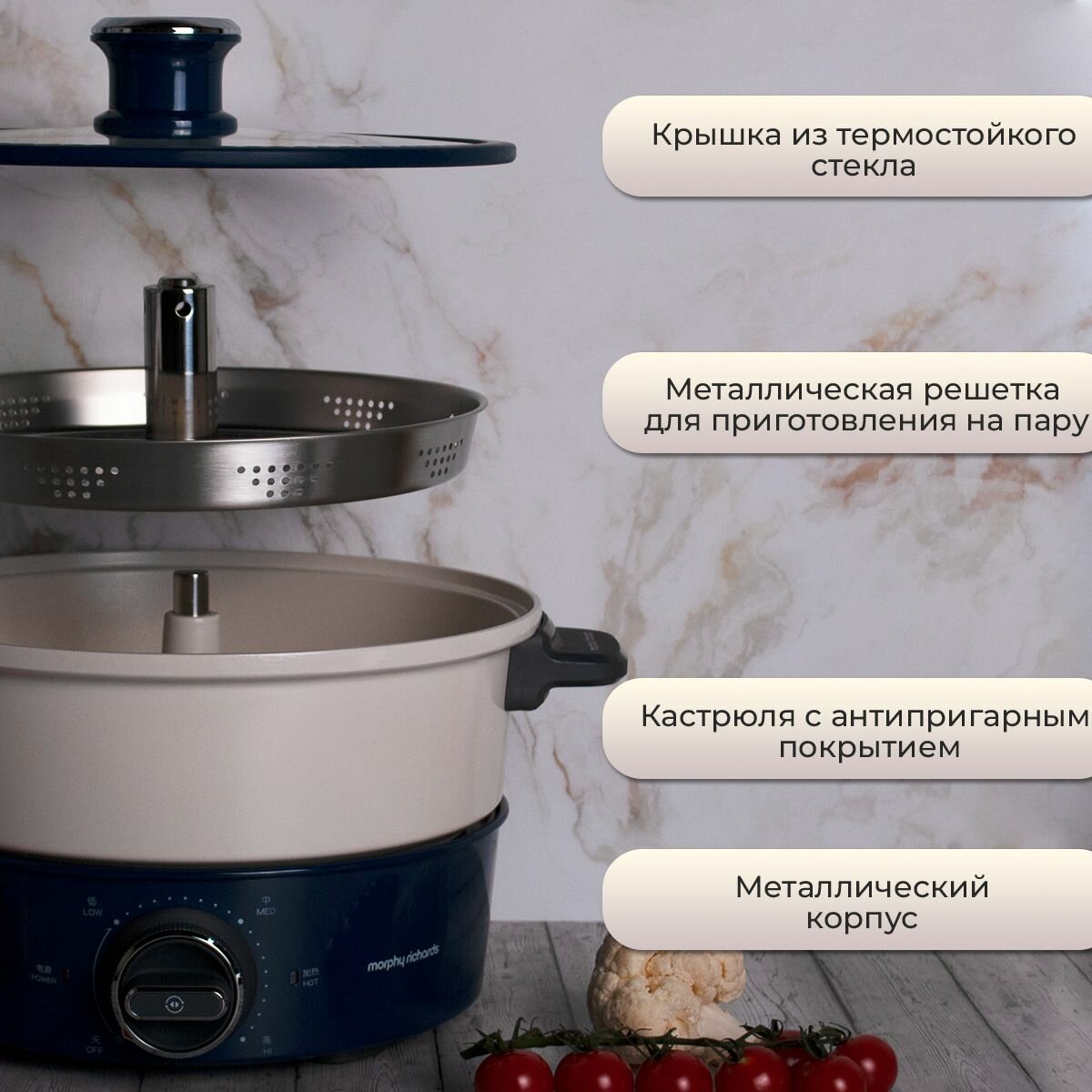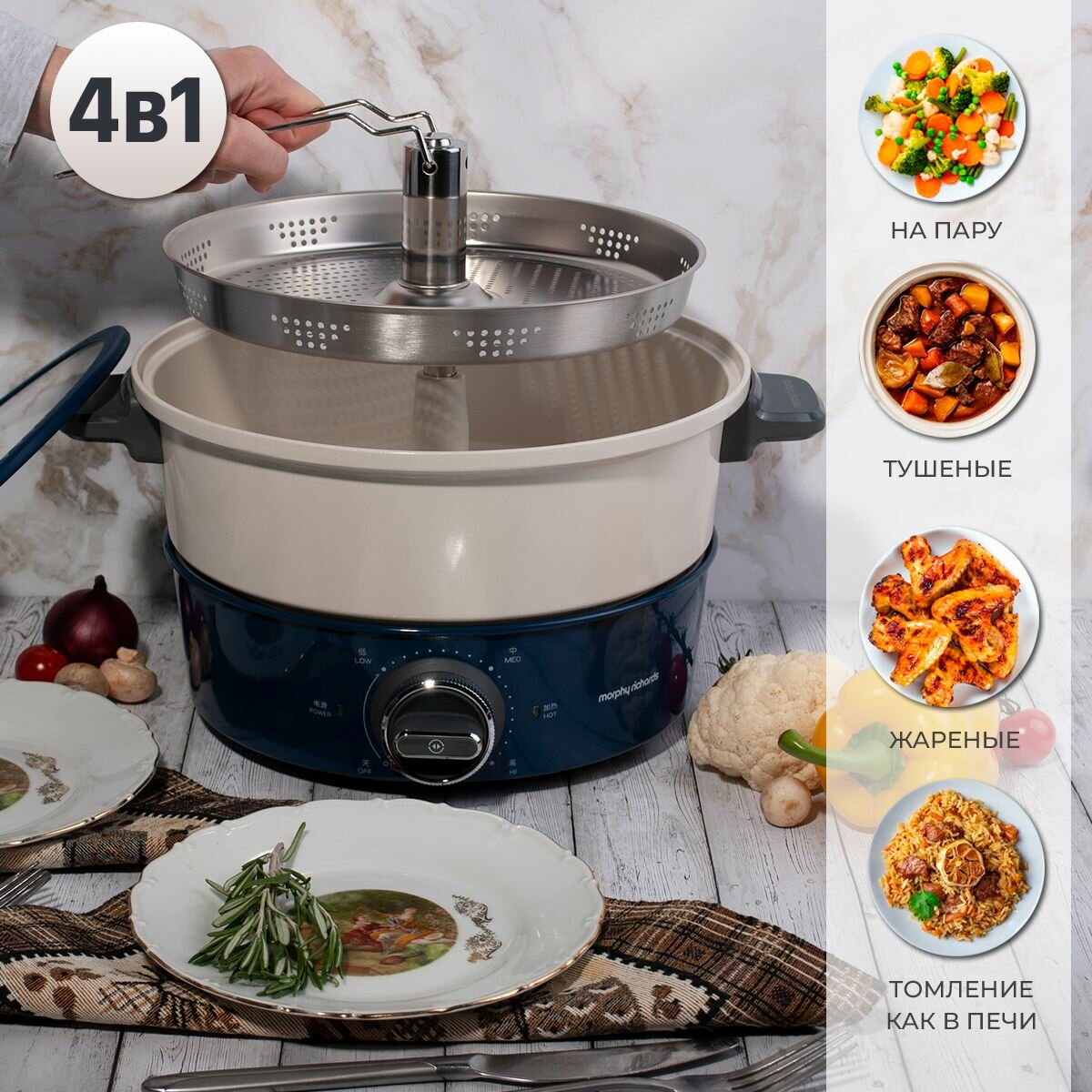 Купить Многофункциональная мультиварка пароварка для здорового питания Morphy Richards с подъемной корзиной, 4 литра, синий-LI с доставкой по всей России.