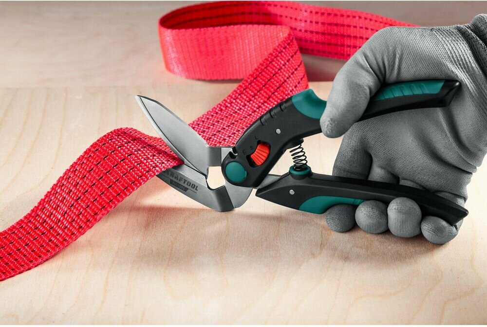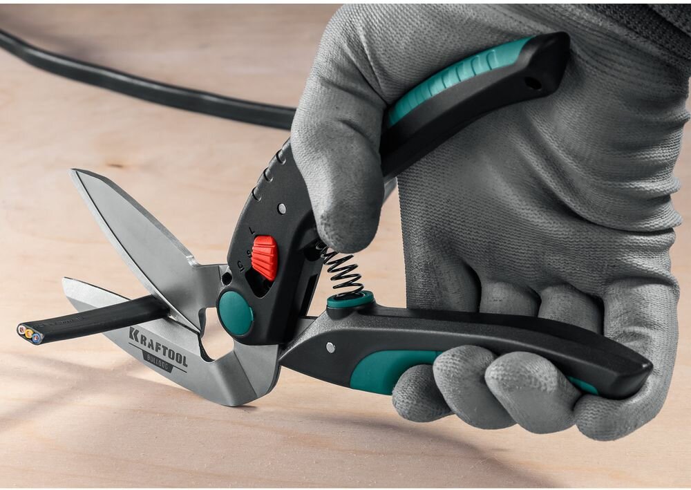 Многофункциональные прямые технические ножницы KRAFTOOL BULLDOG 250 мм, 23203 -Встроенный переключатель для регулировки ручки под необходимый размер хвата; -Встроенные кусачки для проволоки и троса; -Возможность правого реза благодаря изогнутым лезвиям; -Специальная многоуровневая процедура заточки обеспечивает плавный, точный рез с минимальными усилиями; -Серрейторная заточка удерживает разрезаемый материал; -Изготовлены из нержавеющей стали; -Лезвия закалены до твердости 55 HRC, поэтому дольше сохраняют остроту и выдерживают высокие нагрузки; -Утолщённое лезвие для прямолинейного реза толстых материалов; -Возможность регулировки смыкания лезвий во время работы при помощи специального болта; Профессиональный усиленные многоцелевые ножницы для мастерской, гаража и дома -Длина общая: 250 мм -Длина режущей кромки: 65 мм -Толщина лезвия: 3,5 мм -Форма: изогнутые -Материал лезвия: нержавеющая сталь -Материал рукояток: двухкомпонентные пластиковые -Режущие способности: оцинкованная сталь 0,5 мм, алюминий 1 мм, пластик 2 мм, медь 0,5 мм, резина 5 мм, кожа 5 мм, алюминиевый/медный провод 2,5 мм, провод медный многожил -Наличие замочка: да -Противоскользящие насечки: да -Наличие встроенного переключателя для регулировки ручки: да 250 мм Ножницы строительные ; технические ножницы ; Многофункциональные ножницы