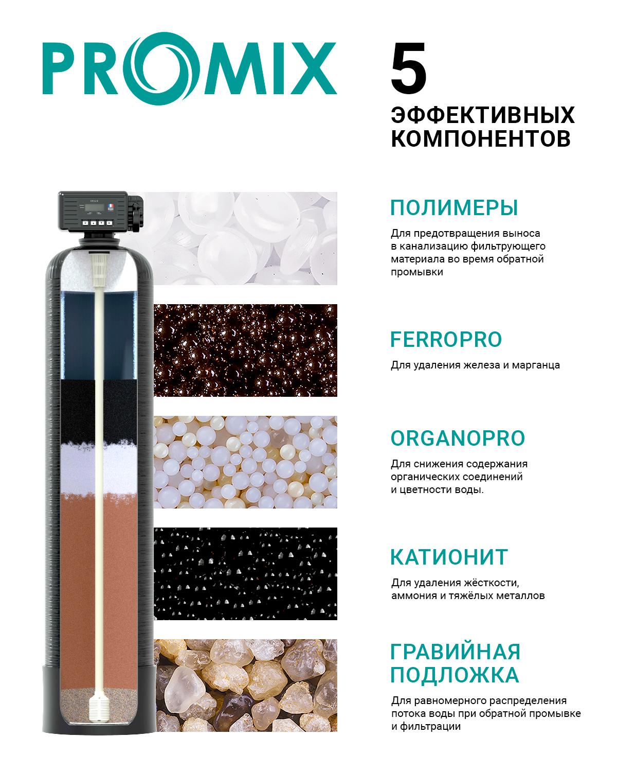 ProMix является универсальным фильтрующим материалом, специально разработанным для эффективного удаления железа, марганца, жёсткости, органических веществ природного происхождения и аммония.