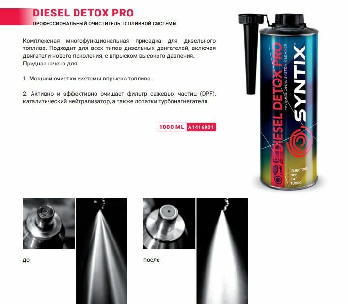 Syntix Diesel Detox Pro - это комплексная многофункциональная присадка к дизельному топливу. Оно специально разработано для всех дизельных двигателей, включая новейшие поколения с впрыском под высоким давлением.