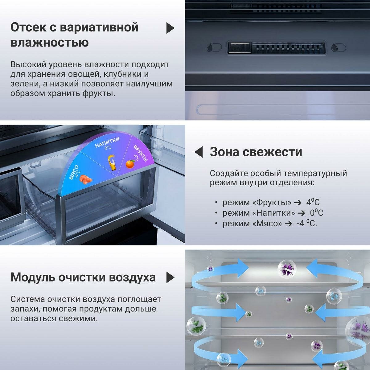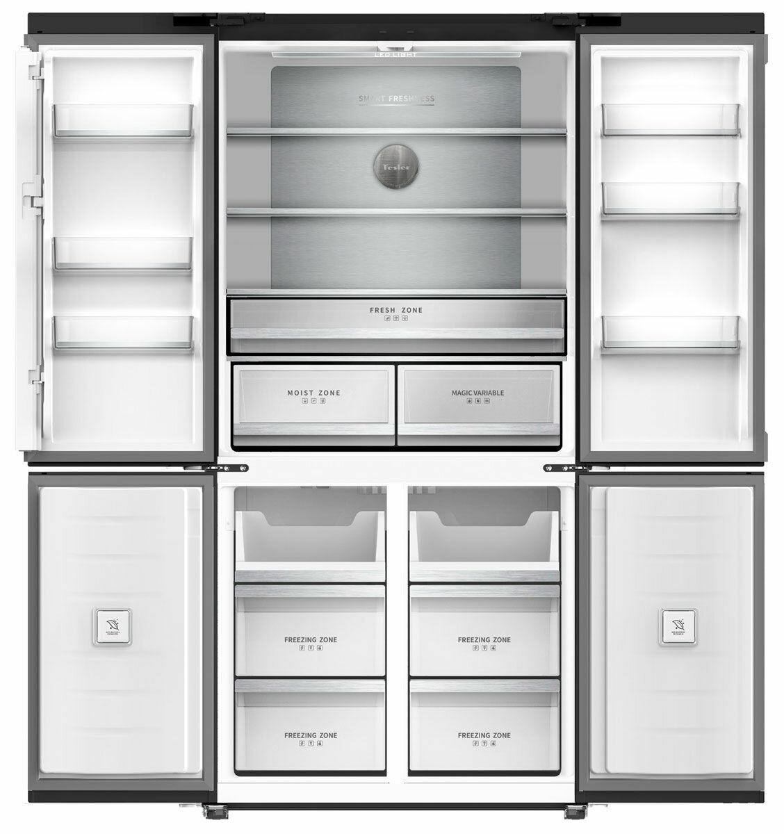 Предлагая широкий выбор настроек и режимов, двухкамерный холодильник TESLER RCD-547BI остаётся простым в управлении, и поможет сохранить свежесть продуктов надолго. Совмещает преимущества отдельно стоящих И встраиваемых холодильников. Устройство обладает уникальным дизайном, который позволяет частично встраивать его в кухонный гарнитур: глубина корпуса составляет 60 см, поэтому он может быть установлен в одну линию со стандартной кухонной мебелью. Благодаря инновационной системе охлаждения расстояние от боковых сторон до корпусной мебели может составлять всего 5 мм. Таким образом исключается перегрев, что способствует продлению срока службы устройства. Продуманная конструкция обеспечивает минимальный зазор при открытии дверей холодильника, что делает удобным его использование в ограниченных пространствах. Равномерное И быстрое охлаждение C технологией METAL COOLING. Встроенная в заднюю стенку пластина из алюминия эффективно распределяет холод, обеспечивая стабильную температуру внутри холодильной камеры. Это позволяет долго сохранять свежесть продуктов даже при частом открывании дверцы. Благодаря этой технологии в холодильной камере исключаются сильные перепады температуры, что позволяет увеличить сроки хранения продуктов. Инновационная технология Metal Cooling поддерживает стабильную работу холодильника, а стильный дизайн пластины подарит вам эстетическое удовольствие от пользования устройством. Инверторный компрессор. Постоянство температуры и влажности внутри холодильника гарантировано — инверторный компрессор работает эффективно, не создавая лишнего шума. Высокий класс энергоэффективности A+ позволит сократить расходы на электроэнергию. Холодильник НЕ нужно размораживать. Благодаря технологии Full No Frost лёд не намерзает внутри камер, там поддерживается оптимальный для хранения продуктов микроклимат без образования инея. Найдется место для всего. Большой полезный объем холодильника в 541 л предоставит достаточно места для хранения продуктов и напитков. Холодильное отделение с полезным объемом 320 л оборудовано просторными полками и дверными карманами, некоторые из которых вы можете убрать в случае необходимости. Отсек с повышенной влажностью и отделение с вариативной температурой помогут создать оптимальные условия для различных видов продуктов, сохраняя их свежесть и вкус. Над ними располагается фреш-зона для овощей и фруктов. Замораживайте больше продуктов. Полезный объем морозильного отделения 189 л предоставит вам достаточно места для длительного хранения продуктов и заморозки заготовок на зиму. Пространство разделено на 4 больших ящика и 2 выдвижных поддона, и позволит разместить даже габаритные продукты. Если нужно одномоментно заморозить большой объём — поможет функция «Быстрая заморозка», которая установит в морозильной камере температуру -28°С на 24 часа. Яркое внутреннее освещение. Встроенная светодиодная подсветка всегда поможет найти нужный продукт без существенного расхода электроэнергии. Интуитивно понятное управление. Цветной LED дисплей поможет настроить нужные параметры для каждой из камер по отдельности, либо активировать автоматические режимы. Температура холодильной камеры может быть установлена в диапазоне от 2⁰С до 8⁰С, температура морозильной – от -23 ⁰С до -15⁰С. B случае необх