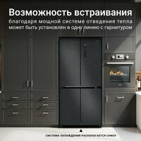 Устройство обладает уникальным дизайном, который позволяет частично встраивать его в кухонный гарнитур: глубина корпуса составляет 60 см, поэтому он может быть установлен в одну линию со стандартной кухонной мебелью. Благодаря инновационной системе охлаждения расстояние от боковых сторон до корпусной мебели может составлять всего 5 мм. Таким образом исключается перегрев, что способствует продлению срока службы устройства. Продуманная конструкция обеспечивает минимальный зазор при открытии дверей холодильника, что делает удобным его использование в ограниченных пространствах.