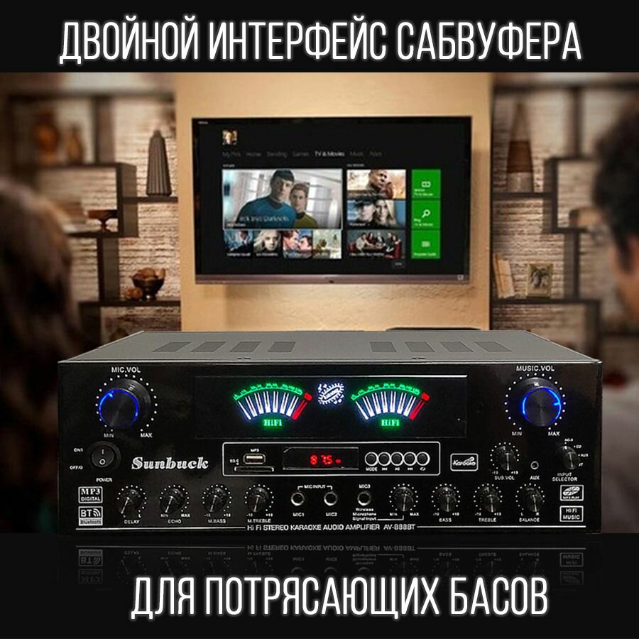 Sunbuck AV-888BT– многоканальный 5.1 усилитель с поддержкой звука Surround, современным модулем Bluetooth 5.0 для беспроводного подключения смартфонов и приятным внешним видом. Устройство обеспечивает номинальную мощность 400 Вт для левого и правого каналов , каждого из каналов объемного звучания, а также для выхода на пассивный сабуфер (пиковая мощность 900Вт). Для проводного подключения используются несколько позолоченных RCA входов, два источника можно подключить одновременно. Пассивная акустика подключается к стандартным разъемам с пружинной клеммой, а для активных колонок или сабвуфера предусмотрен RCA выход. Помимо этого устройство поддерживает воспроизведение музыки в формате mp3 с флешки или карты SD объемом до 64Гб, а также включает тембр блок, встроенный приемник FM радио и функцию караоке с возможностью подключить два микрофона через входы 6.3мм и регулировать эффект echo и их громкость отдельно от общей. В комплект входит пульт для дистанционного управления режимами воспроизведения, встроенным плеером и радиоприемником. Усилитель работает с колонками от 4-х до 16-и Ом и выдает номинальную мощность до 400 Вт. Sunbuck AV-888BT можно подключить к любым смартфонам, компьютерам и медиаплеерам, он отлично подойдет для домашнего кинотеатра или обычной аудиосистемы для прослушивания музыки. На передней панели расположены ручки для регулировки тембра низких и верхних частот подключенных микрофонов и аудио, регулировки громкости караоке и общей громкости. Также есть настройка эффекта реверберации. Режимы воспроизведения переключаются с помощью кнопки с маркировкой INPUT. Сзади находится входы RCA, выход для подключения активной акустики или сабвуфера, зажимные разъемы для колонок, антенна и кабель для подключения к сети 220В. Корпус усилителя полностью сделан из металла и отлично отводит тепло, устройство не перегревается даже при длительном использовании. Для управления встроенным плеером Sunbuck предусмотрели пять кнопок на передней панели, а также пульт ДУ и LED экран, который позволяет узнать на какой частоте FM находится приемник и какой режим воспроизведения используется в данный момент. Для настройки общей громкости, громкости микрофонов, баланса левого и правого каналов, эффекта echo, громкости низких и верхних частот используются ручки. Несколько входов позволяют одновременно подключить к Sunbuck AV-888BT несколько источников. Беспроводное подключение по Bluetooth остается стабильным на расстоянии до десяти метров. Номинальная мощность 400 Вт Пиковая мощность 900 Вт Стандартный импеданс 4-16 Ом Частотная характеристика 20 Гц - 20 кГц Отношение сигнал/шум >90 ДБ Полное гармоническое искажение <0,5% Чувствительность входного сигнала 200 мВ Рабочее напряжение 220 В 50 Гц