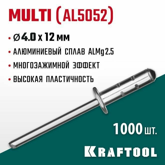 Заклепки алюминиевые многозажимные Multi (Al5052) , 4.0 х 12 мм, 1000 шт, KRAFTOOL: сравнение цен, характеристики, фото, актуальное наличие и цены.