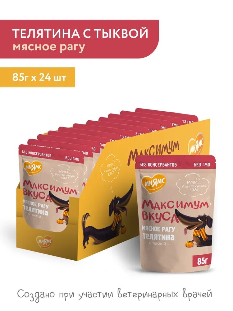 Влажный корм для собак Мнямс «Максимум вкуса» мясное рагу с телятиной и тыквой, паучи, 24 шт х 85 гр: сравнение цен, характеристики, фото, актуальное наличие и цены.