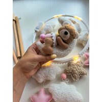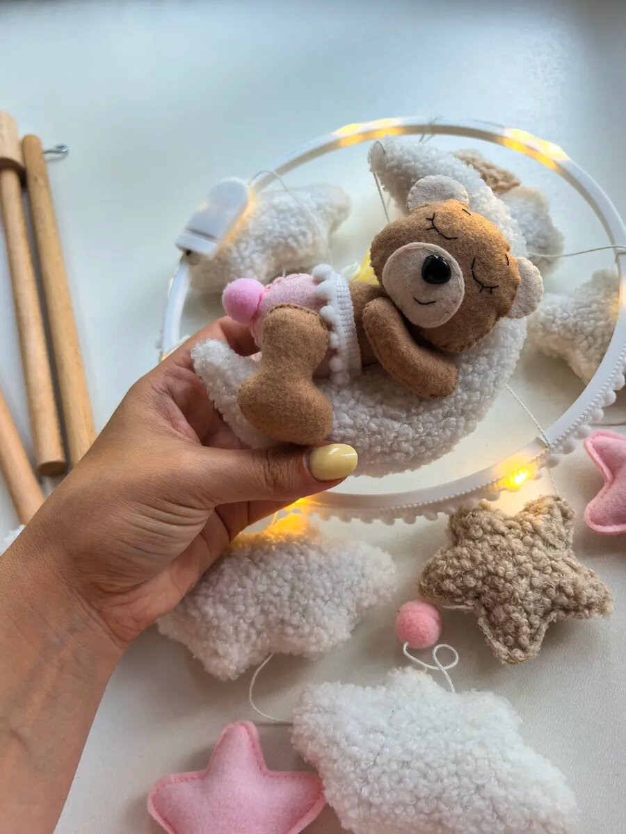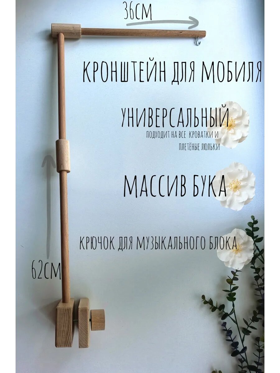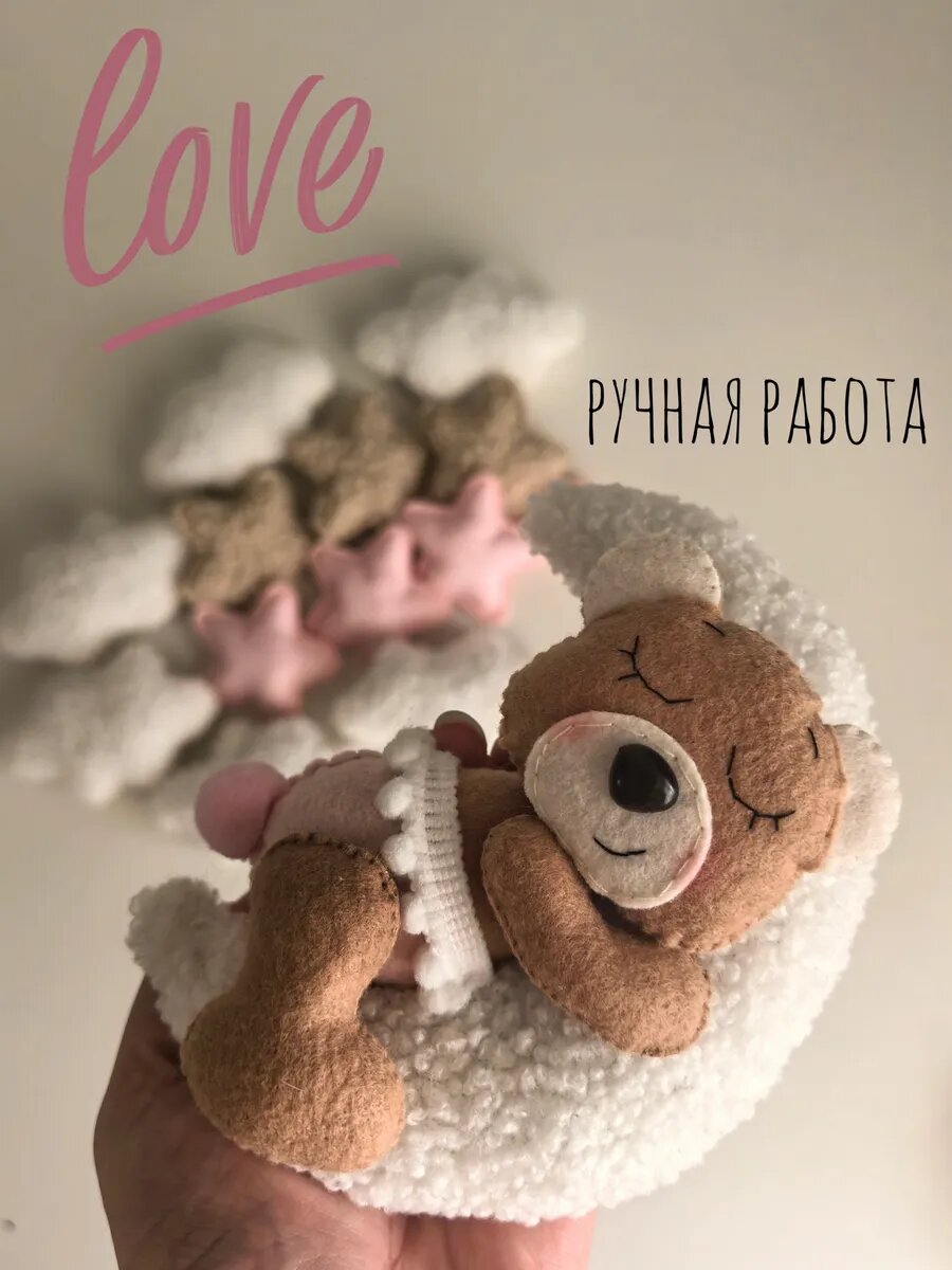 В комплект входит- кронштейн деревянный+механический блок. Диаметр основы с игрушками 23см, высота 35-40 см. Упакован мобиль в подарочную коробку, хорошо подойдет для подарок на выписку или рождение малыша. Рекомендации по уходу: Сухая чистка мягкой щеткой для одежды, сухая чистка липким роликом для одежды, влажная чистка влажной салфеткой. Запрещено: отбеливать, стирать в стиральной машине, выжимать, сушить на батарее. Вращение мобиль может сопровождаться музыкой. Крепление подходит для круглых и прямоугольных кроваток, так же люльки. Наш мобиль, это полностью ручная работа, мы производим мобиль из фетра самого высокого качества.