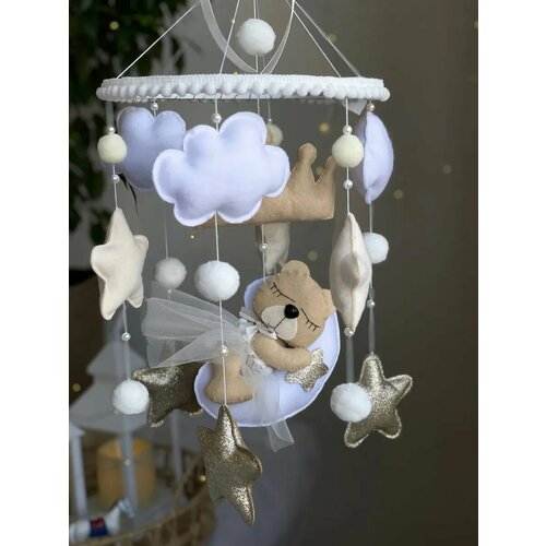 Мобиль с подсветкой в кроватку ручной работы. Уникальная игрушка мобиль для новорожденных, способна убаюкать, успокоить и занять малыша, пока родители заняты своими делами. С месяца ребенок учится фокусировать внимание на предмете и получает первые знания о контрастности и движении. Мобиль из фетра ручной работы выполнен из гипоаллергенных материалов: корейского фетра, блеск из кожзама, наполнитель холлофайбер. Диаметр основы с игрушками 20 см, высота 35-40 см. Упакован мобиль в подарочную крафт коробку, хорошо подойдет для подарок на выписку или рождение малыша. Рекомендации по уходу: Сухая чистка мягкой щеткой для одежды, сухая чистка липким роликом для одежды, влажная чистка влажной салфеткой. Запрещено: отбеливать, стирать в стиральной машине, выжимать, сушить на батарее. Наш мобиль, это полностью ручная работа, мы производим мобиль из фетра самого высокого качества. Мобиль в кроватку из фетра будет шикарным подарком на выписку из роддома