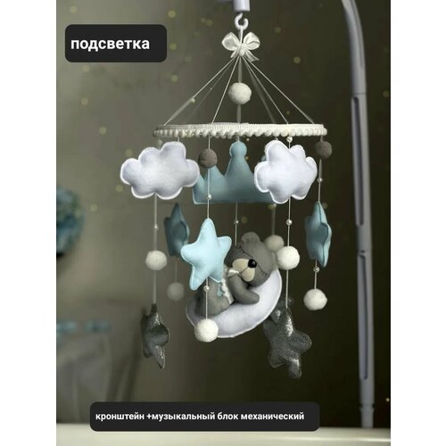 Мобиль с подсветкой в кроватку ручной работы. Уникальная игрушка мобиль для новорожденных, способна убаюкать, успокоить и занять малыша, пока родители заняты своими делами. С месяца ребенок учится фокусировать внимание на предмете и получает первые знания о контрастности и движении. Мобиль из фетра ручной работы выполнен из гипоаллергенных материалов: корейского фетра, блеск из кожзама, наполнитель холлофайбер. Диаметр основы с игрушками 20 см, высота 35-40 см. Рекомендации по уходу: Сухая чистка мягкой щеткой для одежды, сухая чистка липким роликом для одежды, влажная чистка влажной салфеткой. Запрещено: отбеливать, стирать в стиральной машине, выжимать, сушить на батарее. Наш мобиль, это полностью ручная работа, мы производим мобиль из фетра самого высокого качества. Мобиль в кроватку музыкальный можно использовать до 1-2 лет. Мобиль в кроватку из фетра будет шикарным подарком на выписку из роддома