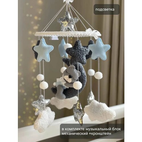 В комплекте нет кронштейна и нет музыкального блока. Мобиль в кроватку ручной работы. Уникальная игрушка мобиль для новорожденных, способна убаюкать, успокоить и занять малыша, пока родители заняты своими делами. С месяца ребенок учится фокусировать внимание на предмете и получает первые знания о контрастности и движении. Мобиль из фетра ручной работы выполнен из гипоаллергенных материалов: корейского фетра, блеск из кожзама, наполнитель холлофайбер. Диаметр основы с игрушками 20 см, высота 35-40 см. Надежное и прочное крепление подвески в кроватку гарантирует спокойствие родителей за ребенка. Мобили, это система подвесок с мягкими игрушками, размещенными на пластмассовой основе. Упакован мобиль в подарочную крафт коробку, хорошо подойдет для подарок на выписку или рождение малыша. Рекомендации по уходу: Сухая чистка мягкой щеткой для одежды, сухая чистка липким роликом для одежды, влажная чистка влажной салфеткой. Запрещено: отбеливать, стирать в стиральной машине, выжимать, сушить на батарее. Мобиль, это система подвесок с мягкими игрушка для кроватки, размещенными на деревянным или пластмассовом круге. Мобиль крепится на бортике в кроватке и имеет поворотный механизм. Вращение мобиль может сопровождаться музыкой. Крепление подходит для круглых и прямоугольных кроваток. Наш мобиль, это полностью ручная работа, мы производим мобиль из фетра самого высокого качества. Мобиль в кроватку музыкальный можно использовать до 1-2 лет. Мобиль в кроватку из фетра будет шикарным подарком на выписку из роддома