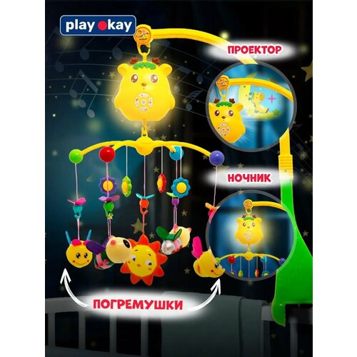 Карусель на кроватку со светом, музыкой и проекцией, артикул HL2020-24. Детский музыкальный мобиль на кроватку для новорожденных с ночником, проектором звездного неба в космосе (на луне которого отдыхает жирафик) и мультяшными сказочными героями, подарят радость и счастье Вашему малышу, т. к. это первая музыкальная игрушка для малыша со светом. Модуль является многофункциональным и устанавливается в кроватку для новорожденного или коляску: для этого используется надежное крепление, кронштейн держатель фиксируется с двух сторон бортика кроватки. Игрушка мобиль в кроватку успокоит и заинтересует вашего малыша, а вы тем временем сможете уделить время себе. Процесс засыпания ускоряется. Детский мобиль для кроватки – это еще и очень забавная карусель в кроватку крохи с 0 лет. Быстрое и удобное крепление мобиля к детской кроватке. Игрушечная подвеска в колыбель подходит для детей с момента рождения и девочке, и мальчику. Дуга с надежным и безопасным креплением. Регулировка громкости музыки. Возможность установить таймер работы мобиля. В комплект входят подвесные игрушки погремушки, которые развивают зрение, координацию движений, слух и начальную моторику. Разные мелодии, проекция и ночник поет малышу колыбельные и детские песенки, которые создадут радостное настроение. Выбирать мелодии можно, нажимая на животик фигурки животного в виде сердечка. Электронная развивающая игрушка на кроватку – замечательный подарок на рождение малышам, на 1 месяц, на 3 месяца, на 6 месяцев, на выписку для младенцев. Мобили и съемные подвески для ребенка изготовлены из экологичного пластика, не выделяют вредных веществ и не имеют запаха – абсолютно безопасны для здоровья детей. Материал изделия: abs-пластик. Игрушки для малышей музыкальной развивающей карусели съёмные (блок с музыкой, пчелка и солнышко), с ними можно играть отдельно и брать их с собой на прогулку. Игрушка работает от трех батареек типа АА 1,5 V, которые не входят в комплект
