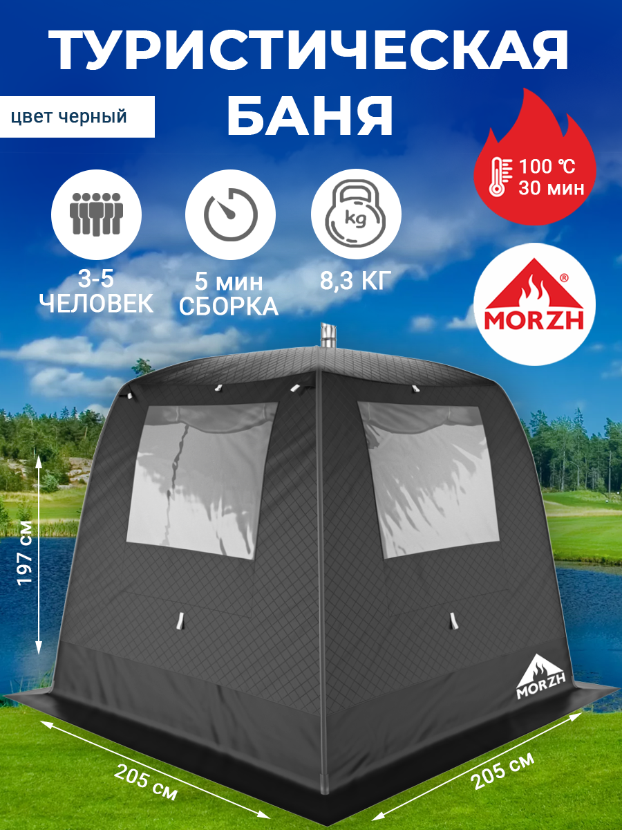Палатка имеет похожую на куб форму и имеет размеры приближенные к 2х2х2 метра. Место для установки печи продумано таким образом, что позволяет максимально компактно разместить печь, не забирая ни одного лишнего сантиметра пространства внутри и не снижая безопасность ее установки. В режиме мобильной бани в палатке может находиться до 5 человек одновременно.