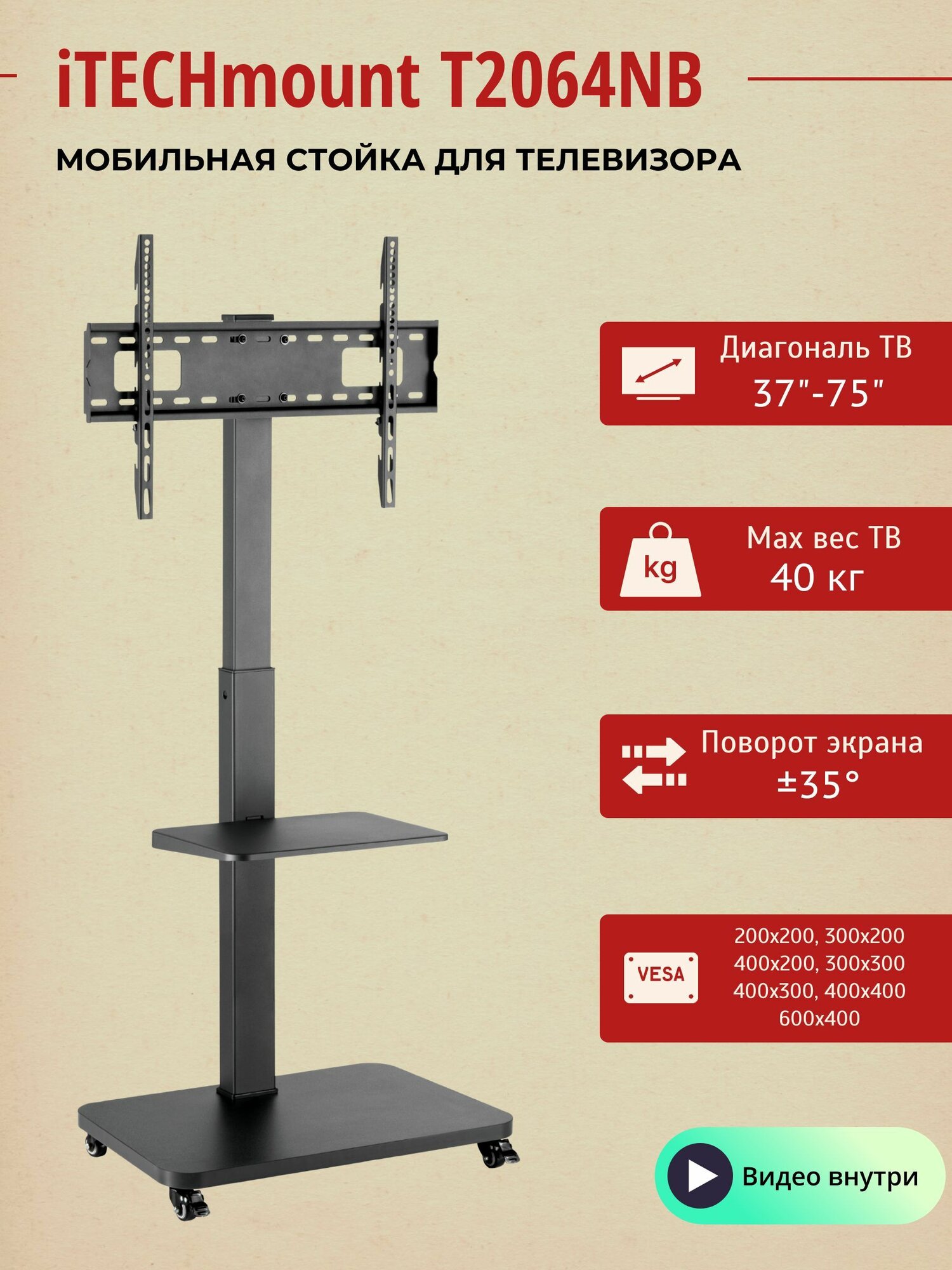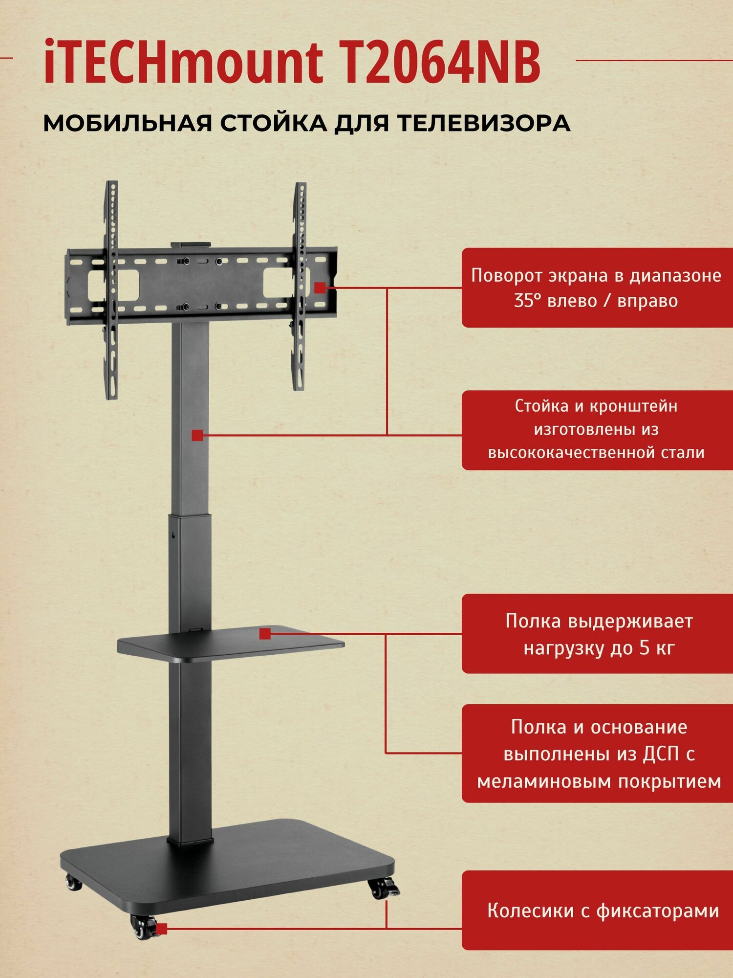 Мобильная презентационная стойка с кронштейном для телевизора iTECHmount T2064NB - это идеальное решение для тех, кто ищет надежную и мобильную стойку для своего телевизора. Эта стойка оснащена кронштейном для телевизоров диагональю от 37" до 75" и весом до 40 килограммов. Кронштейн позволяет поворачивать телевизор на 35° влево и 35° вправо. Высота стойки регулируется на выбор в трех режимах - 1410 мм или 1468 мм или 1526 мм. Кронштейн и основание стойки изготовлены из высококачественной стали. Кронштейн поддерживает совместимость с различными стандартами VESA: 200x200, 300x200, 400x200, 300x300, 400x300, 400x400, 600x400 мм. В основании стойки предусмотрен скрытый кабель-канал, который позволит избежать беспорядка в проводах, подводимых к телевизору. Строгий и в тоже время современный дизайн стойки будет отлично смотреться в любом домашнем или офисном интерьере.