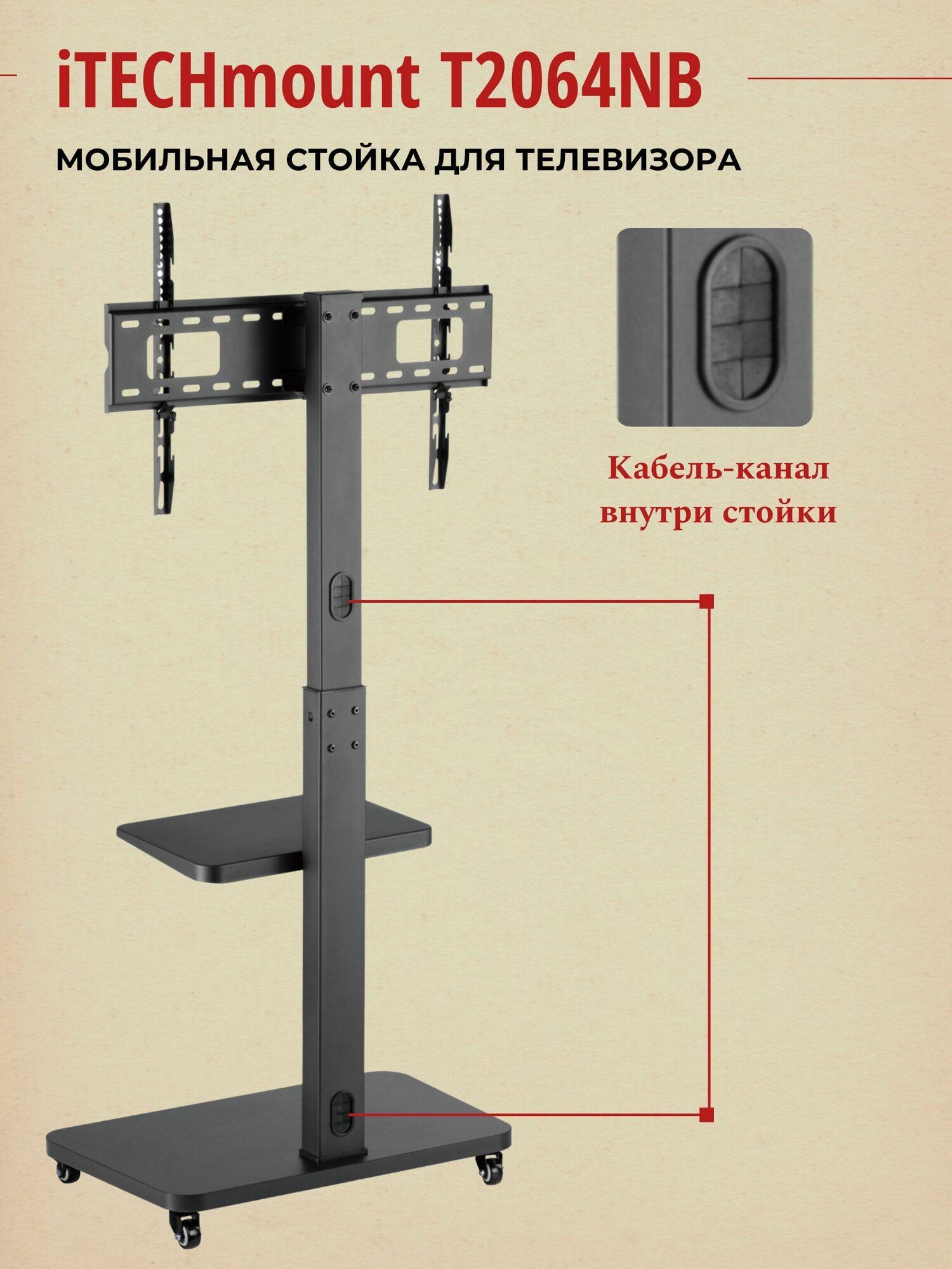 В целом, стойка iTECHmount T2064NB является отличным выбором для тех, кто хочет получить надежную и мобильную конструкцию для своего телевизора с максимальной функциональностью. Она позволяет регулировать высоту и поворот телевизора, а также размещать дополнительные устройства на дополнительных полках.