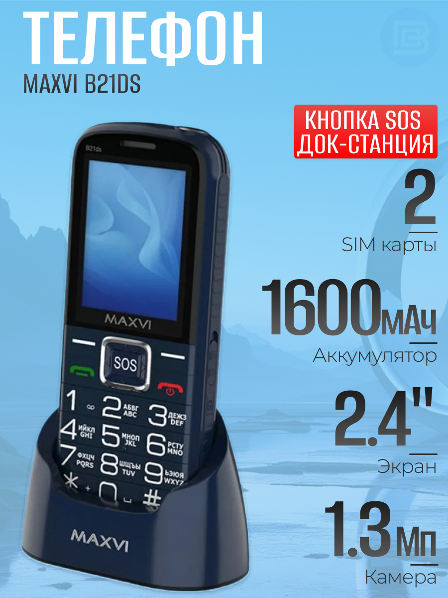 Купить Мобильный телефон кнопочный Maxvi B21ds up Cиний, связь 2G, 2 SIM, экран 2.4″, камера 1.3 Мп, 1600 мАч, фонарик, ЗУ с доставкой по всей России.