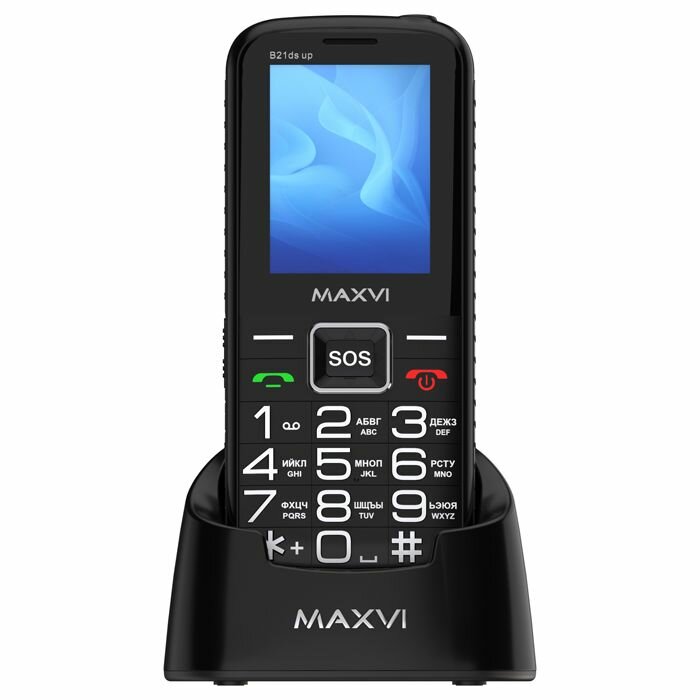 Купить Мобильный телефон кнопочный Maxvi B21ds up Черный, связь 2G, 2 SIM, экран 2.4″, камера 1.3 Мп, 1600 мАч, фонарик, ЗУ с доставкой по всей России.