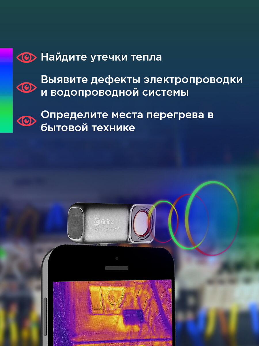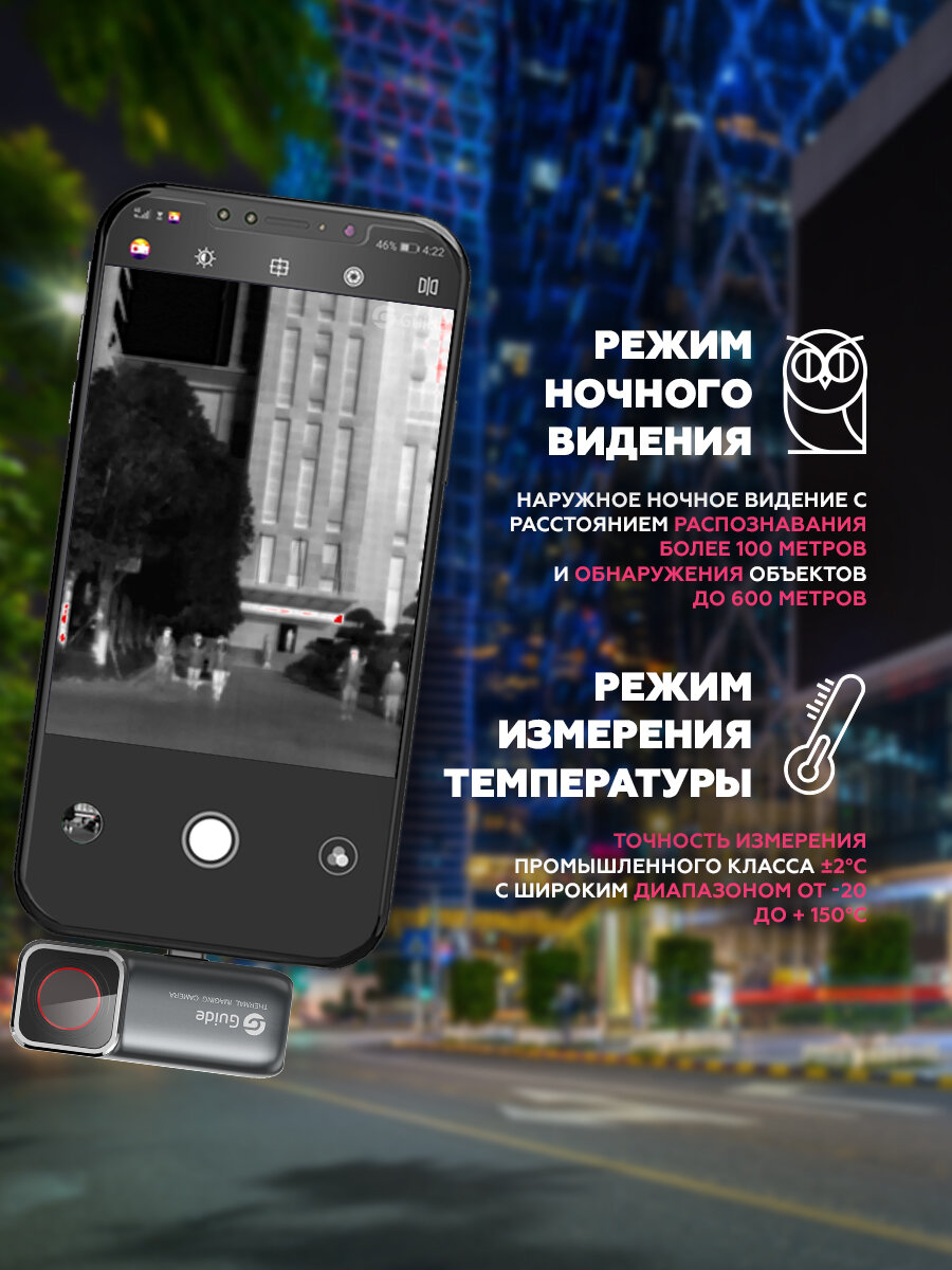 Guide MobIR Air 2T – это первая в мире автофокусная тепловизионная камера для смартфона! Тепловизор для охоты оснащен инкапсулированным инфракрасным детектором WLP, разработанным специально для этой модели. Независимо от того, является ли объект неподвижным или движущимся, вы можете автоматически сфокусироваться на нем, просто коснувшись экрана, чтобы быстро получить четкие тепловые изображения, а благодаря разрешению 256×192 картинка получается максимально детальной. Устройство поможет самостоятельно за секунды решить ряд бытовых задач: найти и устранить утечки тепла, выявить дефекты электропроводки и водопроводной системы, обнаружить места перегрева в бытовой технике и многое другое! Тепловизор строительный Guide MobIR Air 2T работает с помощью удобного мобильного приложения, которое поддерживает следующие режимы: традиционное измерение температуры (точность измерения промышленного класса ±0,5°C с широким диапазоном от -20 до + 150°C), ночное видение (наружное ночное видение с расстоянием распознавания более 80 метров и обнаружения объектов до 200 метров). Помимо автоматической фокусировки, модель также оснащена специальным режимом «Измерение температуры», который значительно расширяет возможности применения Guide Mobir AIR 2T. При включении этого режима активируется функция многоточечного автофокуса – тепловизор сам определяет точки на изображении с самой высокой температурой и показывает их. При этом само измерение происходит в режиме реального времени. Такая опция отлично подходит для мониторинга работы двигателей, электрических соединений и температуры людей. Guide MobIR Air 2T – профессиональные возможности в ваших руках!