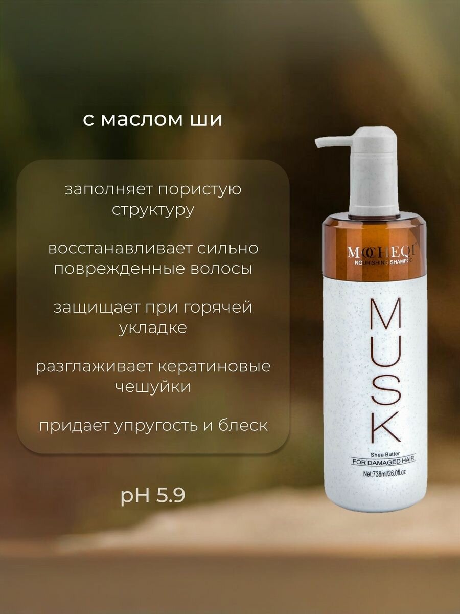 Шампунь для сухих, поврежденных, окрашенных волос MOCHEQI MUSK с гидролизованным кератином и маслом ШИ, 738 мл: сравнение цен, характеристики, фото, актуальное наличие и цены.