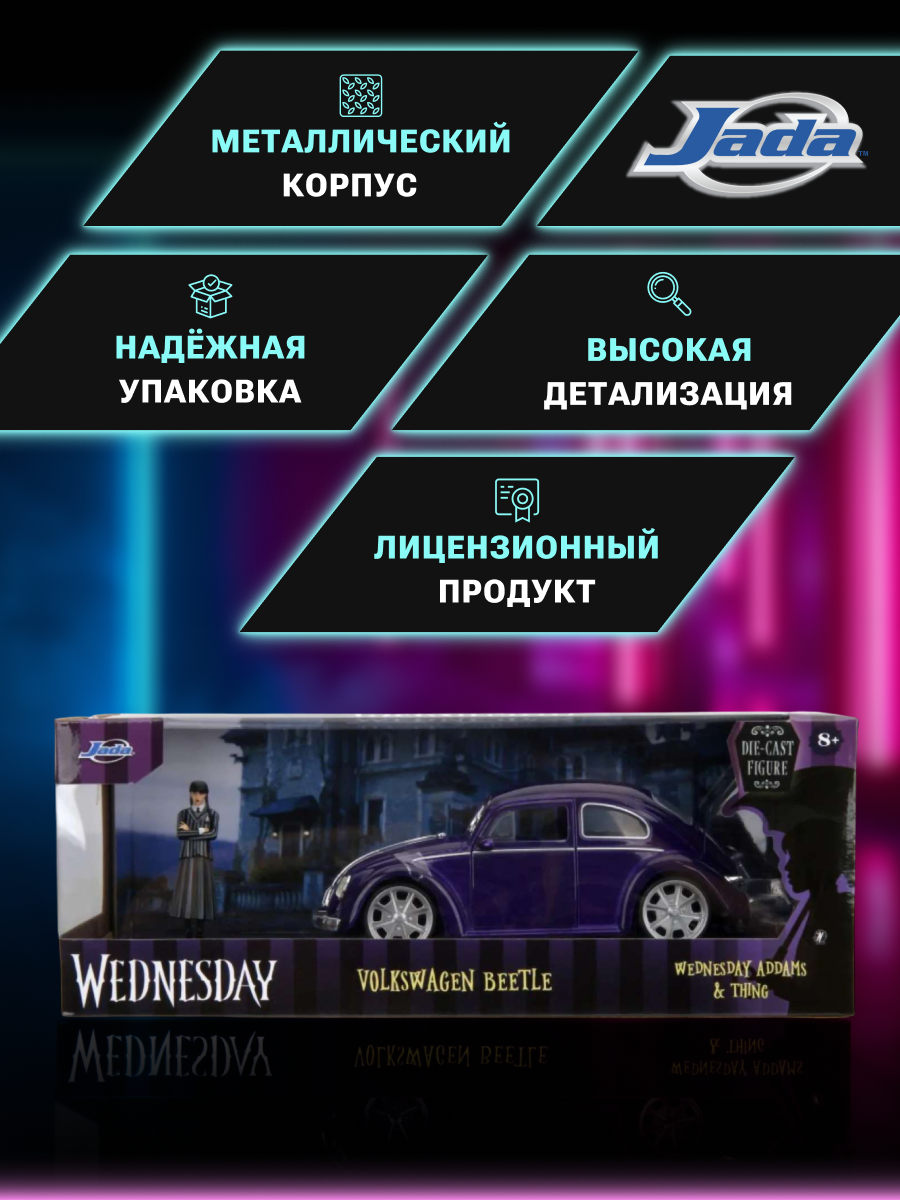 Модель Машинки c Фигуркой Hollywood Rides 1:24 Wednesday 35131 по мотивам сериала "Уэнздей". Характеристики: