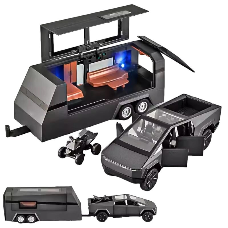 Точная копия модели Tesla Cybertruck с жилым прицепом на несколько человек и квадроциклом. Материал кузова автомобиля – металлический сплав, что гарантирует долговечность и надежность игрушки.