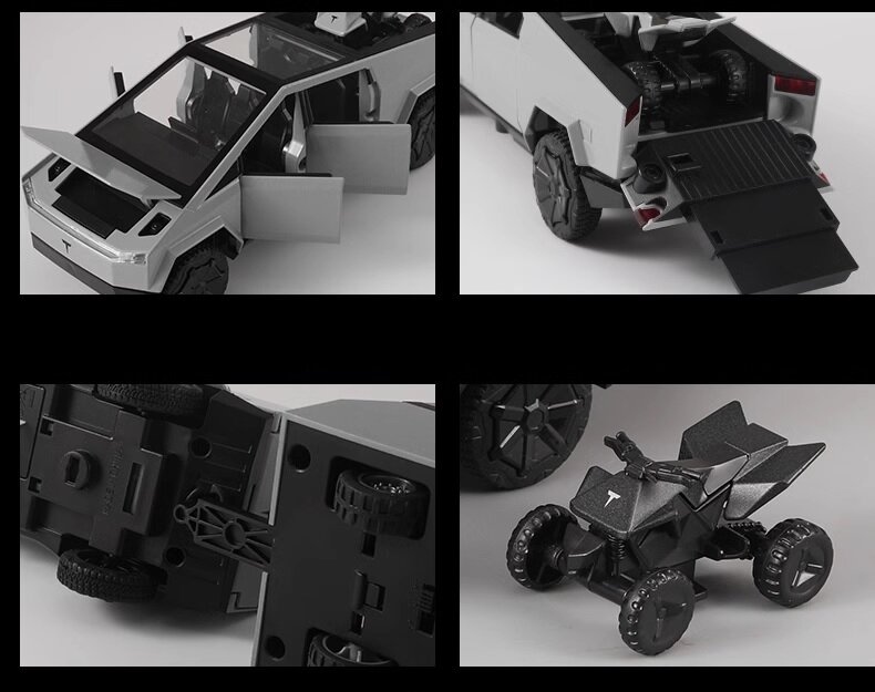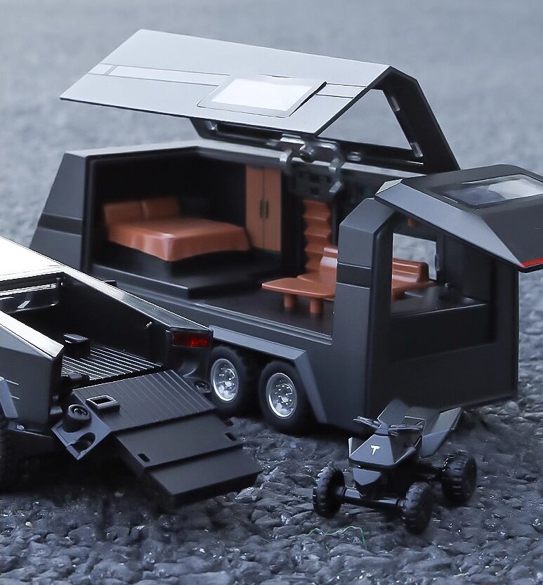 Точная копия модели Tesla Cybertruck с жилым прицепом на несколько человек и квадроциклом. Материал кузова автомобиля - металлический сплав, что обеспечивает долговечность и надежность игрушки.