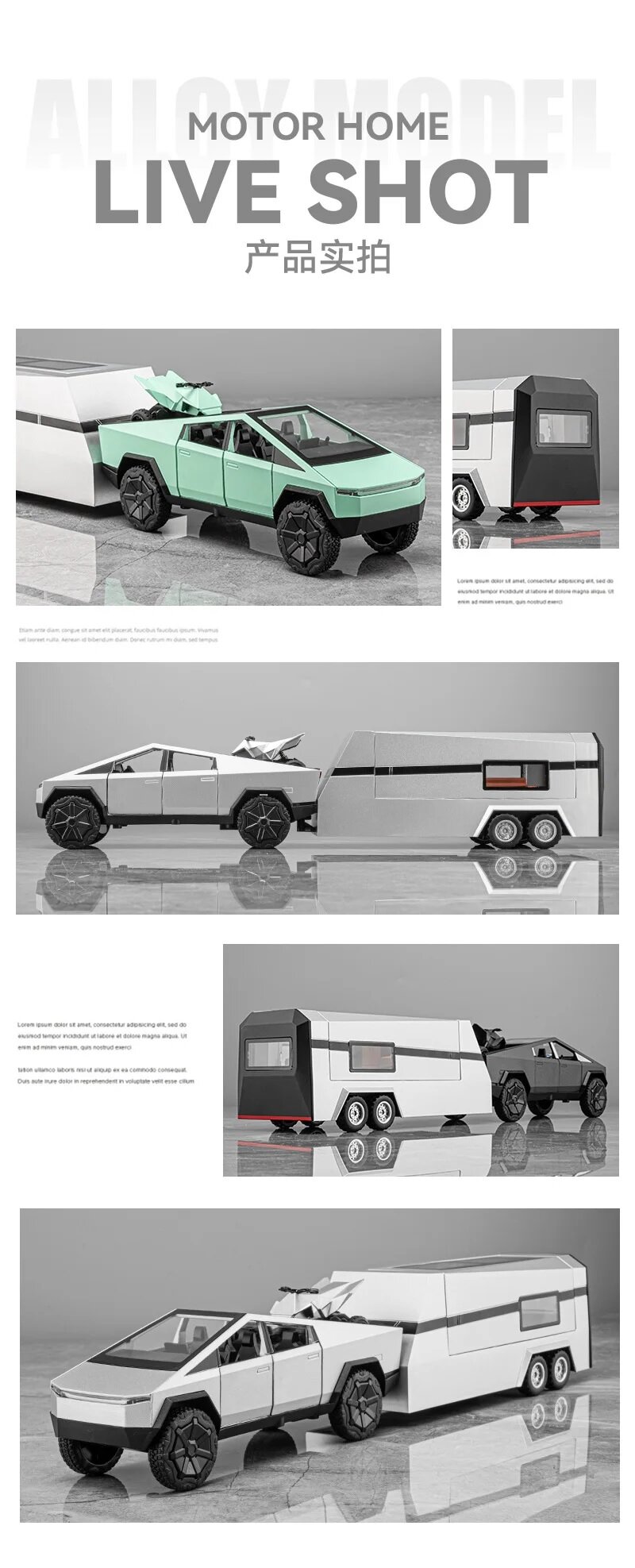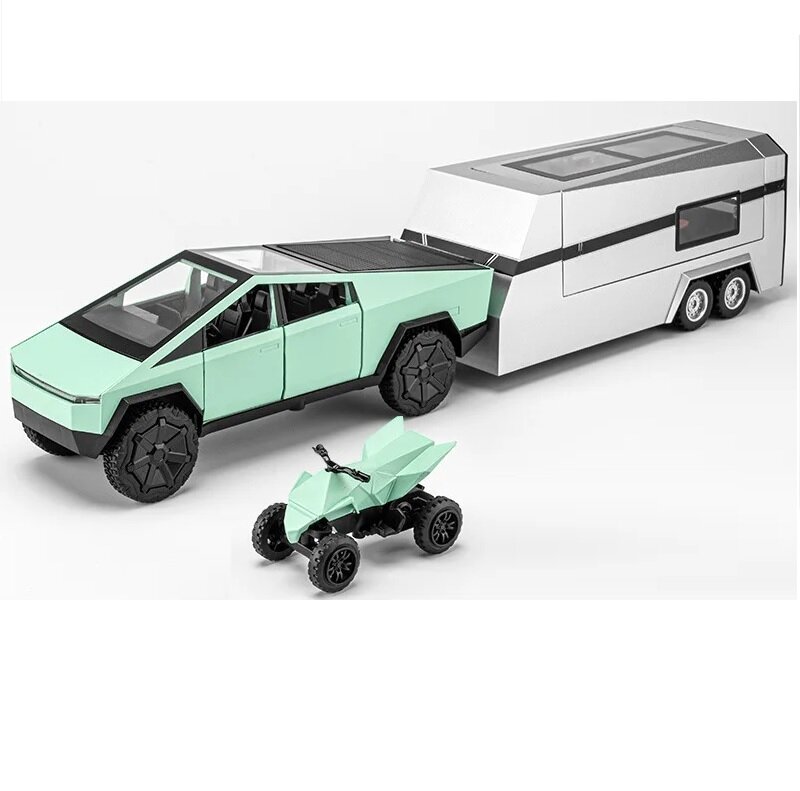 Модель металлическая Tesla Cybertruck Pickup с кемпером и квадриком 35 см. свет, звук CZ58A (Цвет: Фисташковый) - это точная копия автомобиля Tesla Cybertruck с жилым прицепом на несколько человек и инерционным квадроциклом.