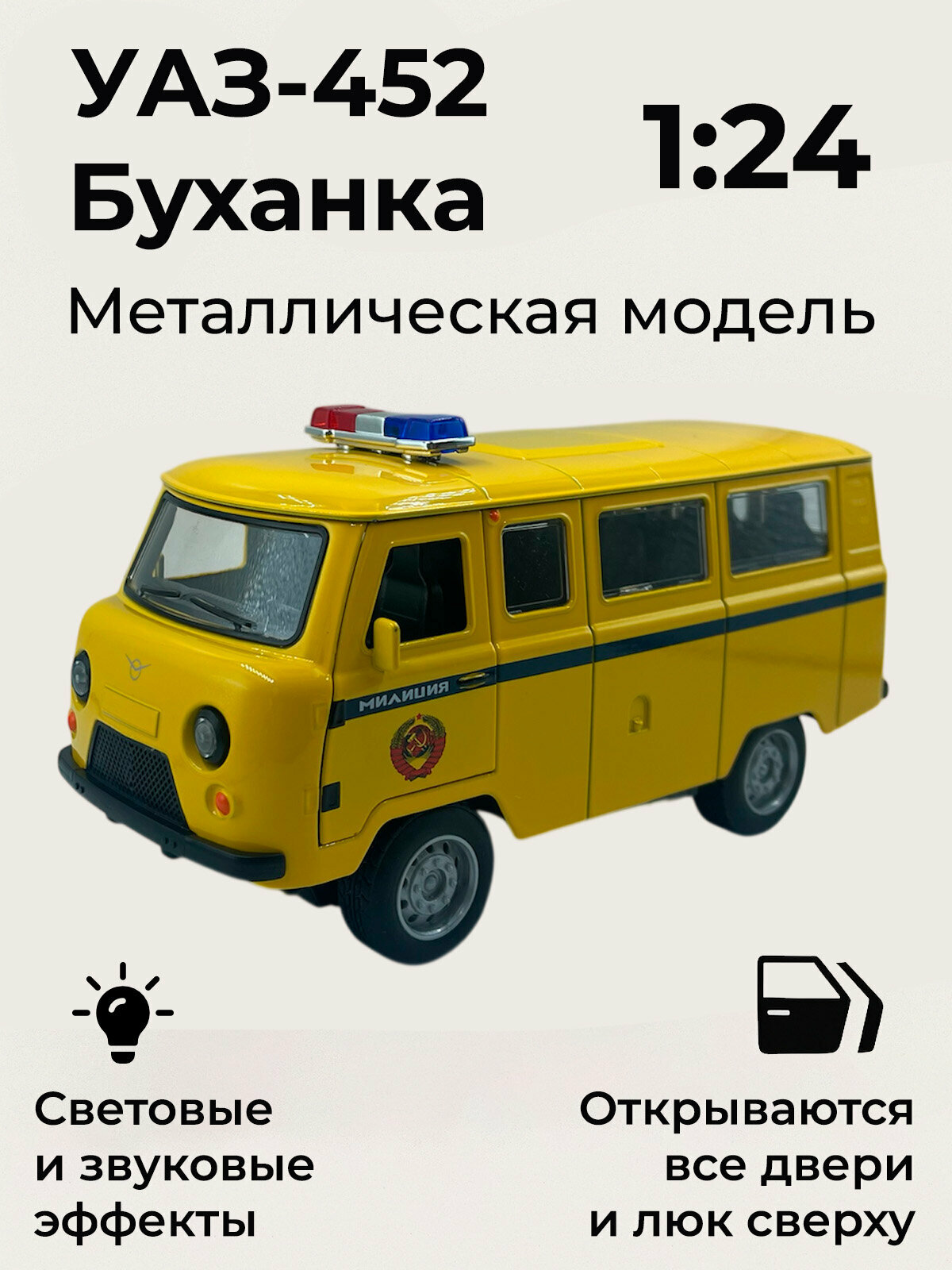 | Особенности | батарейки в комплекте, детская, коллекционная, открывается капот/багажник, открываются дверцы, советские машинки, звук, свет |