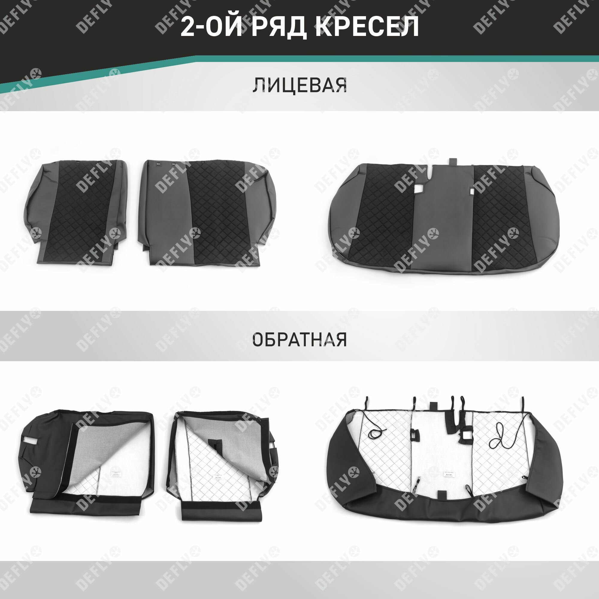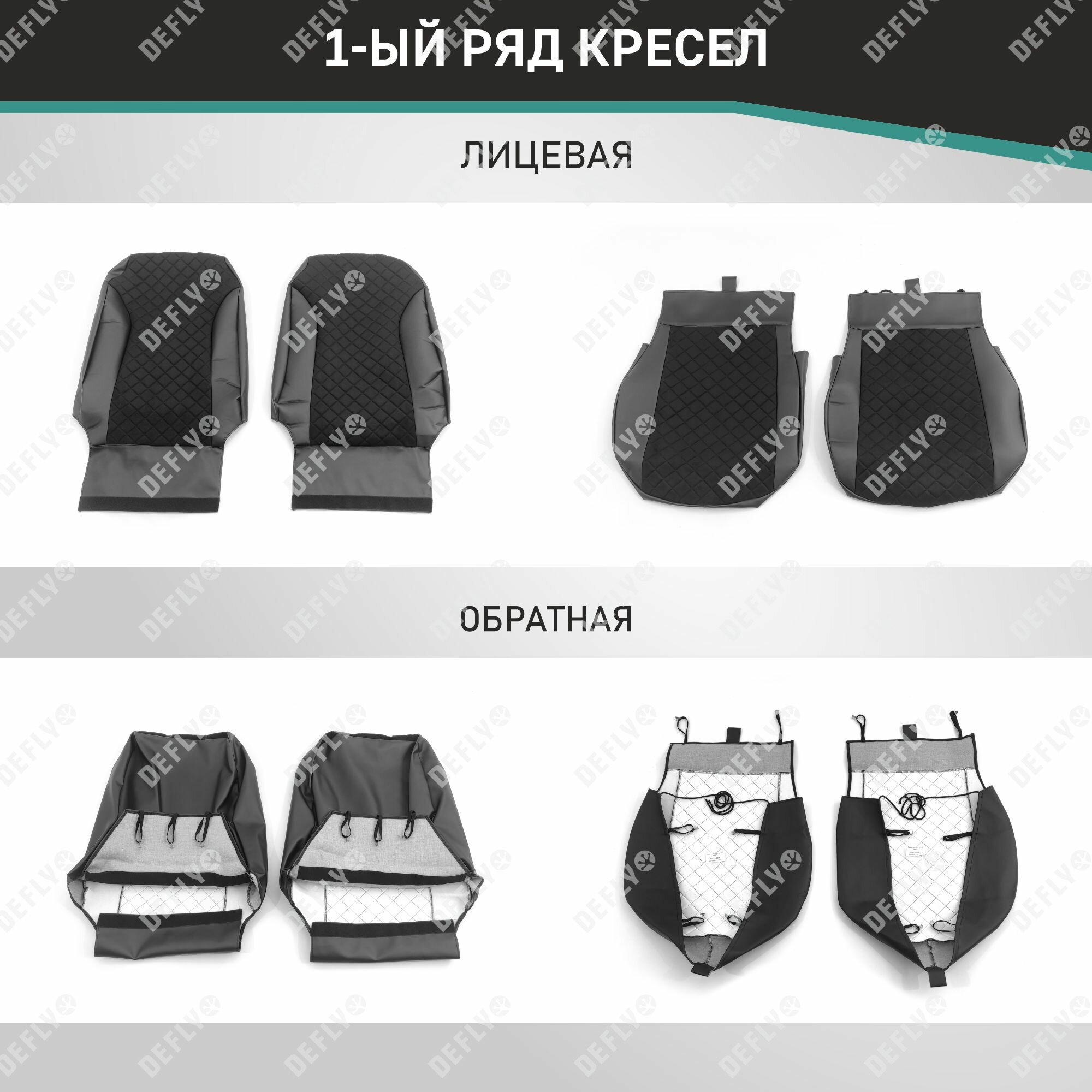 Материал: Экокожа гладкая, замша, Узор на вставках: прострочка «Ромб», Цвет: Черный (оттенок ткани может незначительно отличаться). Модельные чехлы от производителя “Defly” индивидуально сконструированы для каждого автомобиля. Изготовленные по лекалам оригинальных кресел, чехлы гарантируют идеальную посадку. В комплектацию входят детали всех элементов салона: передних кресел, заднего дивана, третьего ряда сидений, подголовников, подлокотников и т. д. Спинки передних кресел дополнены карманами. Все швы и технологические отверстия обработаны на оверлоке. Чехлы не ограничивают заводскую функциональность салона. Наличие в чехлах специального распускаемого шва не препятствует своевременному и полному раскрытию подушек безопасности. Специально разработанная система креплений позволяет надежно зафиксировать изделия. В комбинированных чехлах этой серии подголовники, боковые и задние элементы выполнены из черной экокожи, а центральные вставки сидений изготовлены из замши с прострочкой “Ромб”. Гарантируют комфортную посадку и приятные тактильные ощущения. * Представленные фотографии являются примером исполнения и служат для демонстрации материалов и конструкции чехлов.