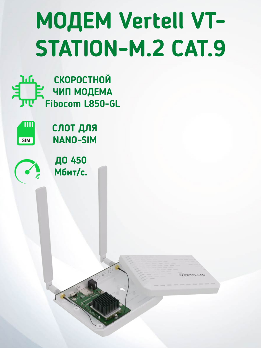Модем M.2 Vertell VT-STATION-M.2 в корпусе на базе Fibocom L850-GL с агрегацией частот Cat 9 со скоростью до 450 Мбит/с: сравнение цен, характеристики, фото, актуальное наличие и цены.