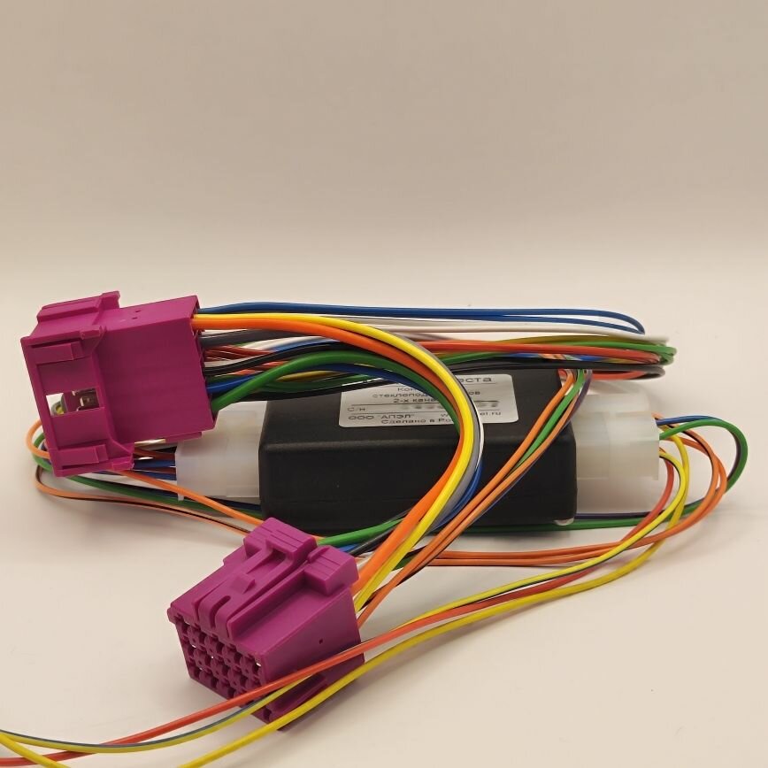 Комплект модуля МАКС-2 Vesta оснащён жгутом проводов со разъёмами для подключения без нарушения штатной проводки к кнопкам стеклоподъёмников автомобилей LADA Vesta.