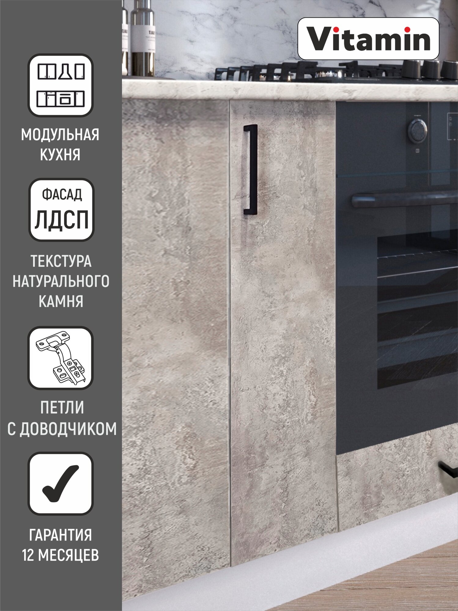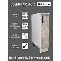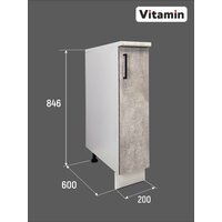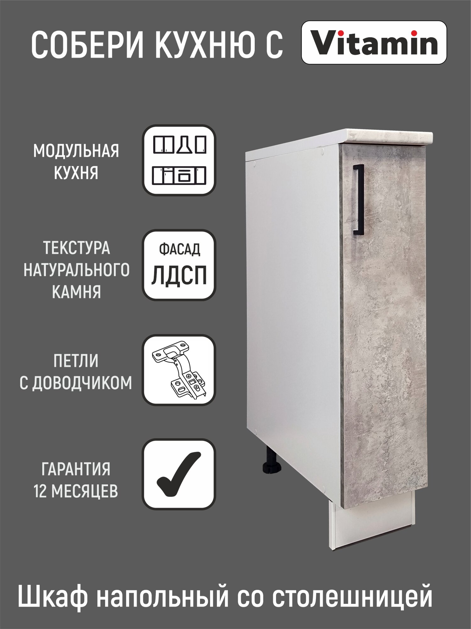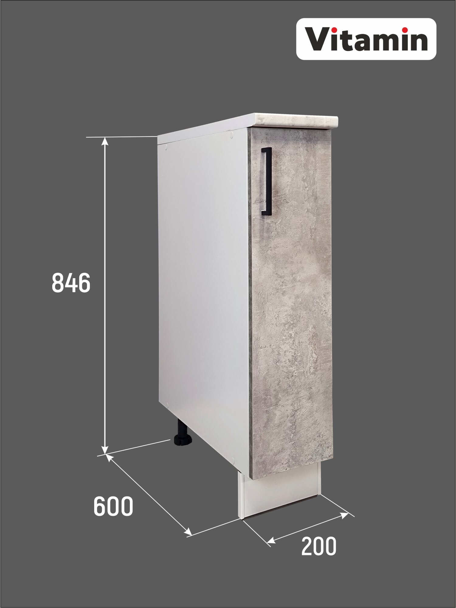 Кухонный модуль напольный очень функционален и может быть использован как шкаф для хранения вещей на кухне, шкаф-пенал, кухонный шкаф для посуды, модуль кухонный напольный, тумба для хранения кухонных принадлежностей, стол кухонный, шкаф для хранения одежды, шкаф для хранения продуктов, кухонный шкаф посуда и инвентарь, шкаф для посуды, шкаф для посуды на кухню, бутылочница выдвижная. Кухонный стол подойдет для небольших квартир, домов, для дачи и летних веранд. Шкаф напольный кухонный впишется в любой стиль: лофт, минимализм, модерн, скандинавский, эко. Корпус и фасады кухонных шкафов изготовлены из высококачественной ЛДСП класса Е1. А это значит, что мебель полностью соответствует международным стандартам ГОСТ по экологическим показателям и безопасна даже для изготовления детской мебели. Для отделки торцов использована кромка ПВХ толщиной 1 мм. Кухонная тумба оснащена качественной фурнитурой с доводчиками для плавного закрывания дверки. Надежная фурнитура рассчитана на многократное интенсивное использование. Сверловка под дверки универсальная, т. е дверки можно навешивать как на левую, так и на правую сторону. В комплект входит столешница толщиной 26 мм и цоколь высотой 100 мм. Материал столешницы: влагостойкий пластик, который обладает матовой поверхностью и приятной на ощупь текстурой дерева. Тумба имеет пластиковый съемный цоколь, за которым скрываются регулируемые ножки. Пространство под тумбой закрыто цоколем, что предотвращает скопление мусора под ней. В секции кухонного модуля расположена одна полка. Дверцы украшены оригинальными ручками черного цвета. Глубина для хранения составляет 56 см: шкаф отлично подойдет для хранения посуды, кухонных принадлежностей, продуктов, бутылок. Шкаф напольный не требует специфического ухода: для удаления жирных пятен достаточно использовать мягкое моющее средство. Габариты кухонного модуля в сборе (ШхВхГ): 200 x 846 x 600 мм. Глубина шкафа 560 мм, глубина столешницы 600 мм. Материал корпуса: ЛДСП белый . Материал фасада: ЛДСП, цемент светлый. Цвет столешницы: Мрамор Лацио белый. Шкаф напольный поставляется в разобранном виде. В комплект входит подробная инструкция по сборке и необходимая крепежная фурнитура. Тумба совместима с другими модулями VITAMIN, что позволяет самостоятельно смоделировать кухонный гарнитур нужной конфигурации, подходящий именно Вам.