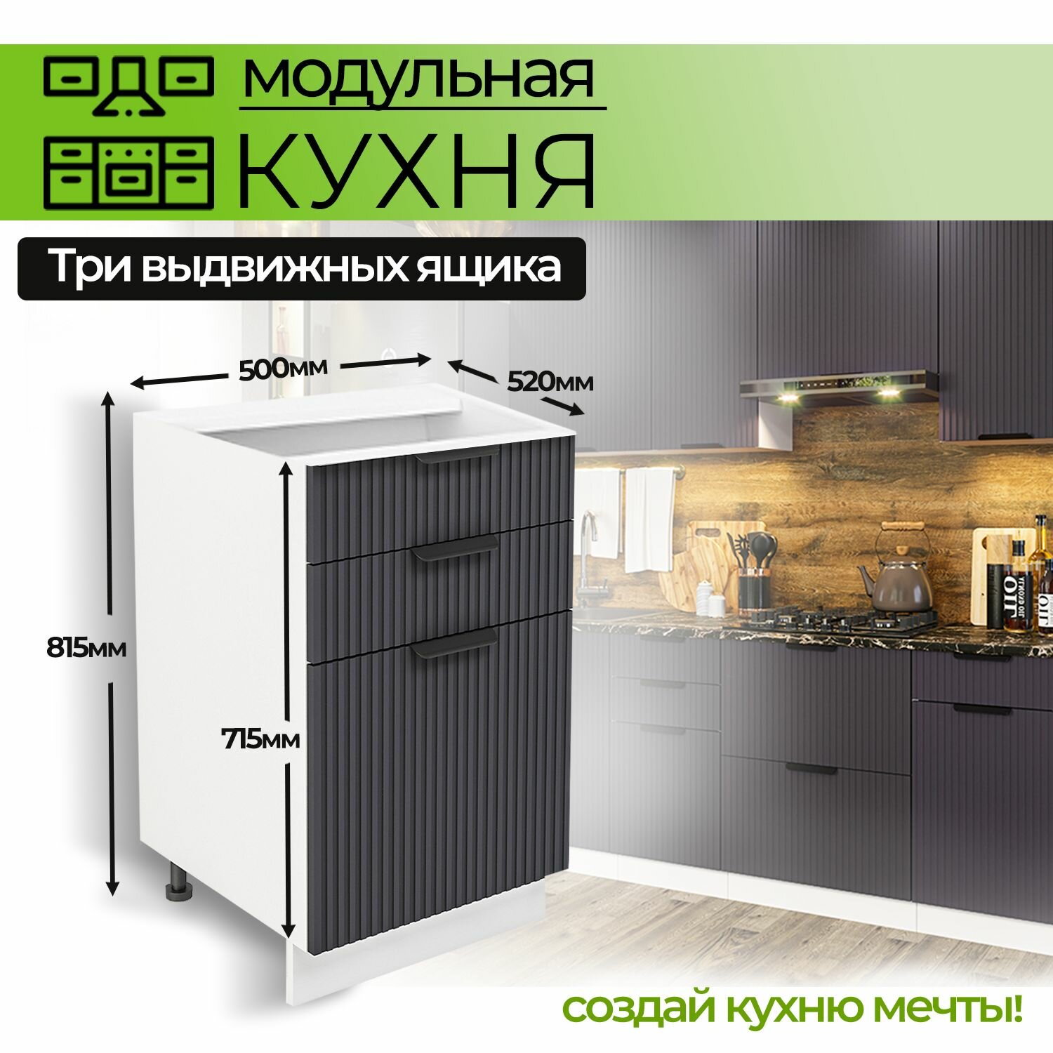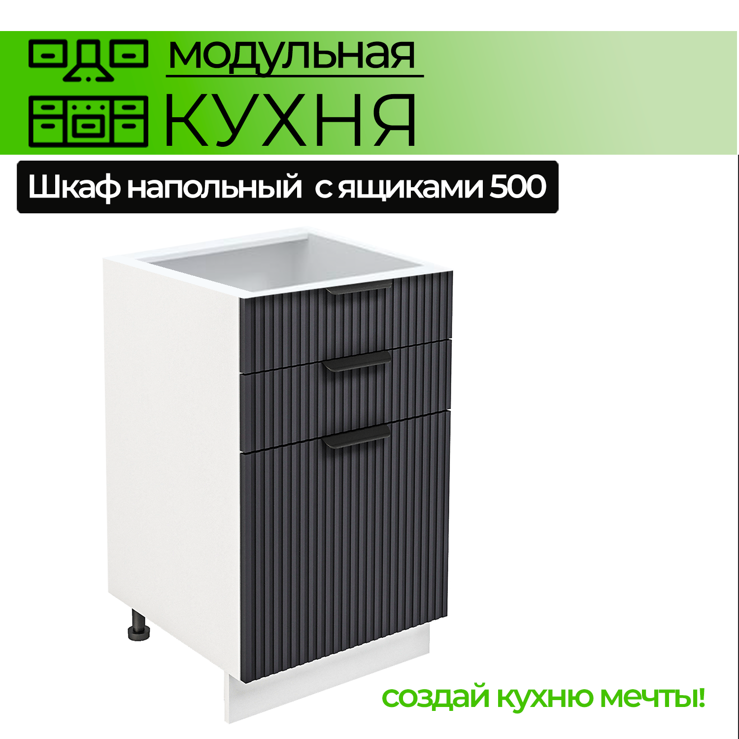 Шкаф напольный с 3-ми выдвижными ящиками 500 мм Модульная кухня Nord Line цвет графит: сравнение цен, характеристики, фото, актуальное наличие и цены.