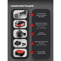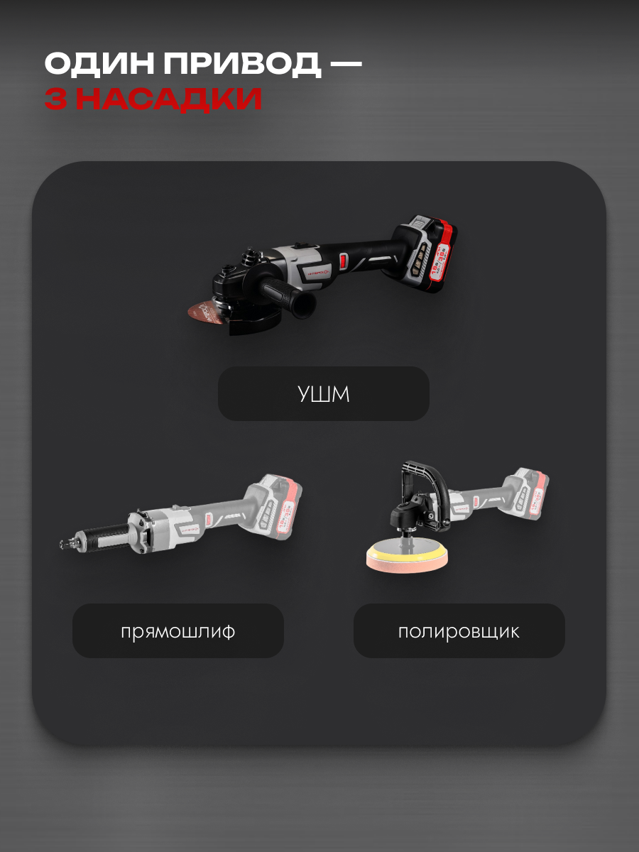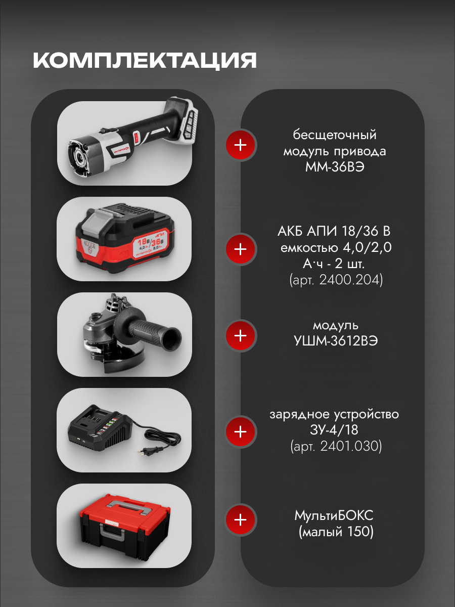 Мощная угловая шлифовальная машина мультимодульной системы ИНТЕРСКОЛ мультимакс 36 - это удобный, функциональный и эффективный аккумуляторный инструмент. Устройство оптимально подойдет всем, чья деятельность так или иначе связана с зачисткой и шлифовкой поверхностей. Возможность регулировки оборотов и оптимально подобранный диапазон частот вращения с поддержанием выбранного режима под нагрузкой, обрезиненный корпус и эргономичная вспомогательная рукоятка, переставляемая в зависимости от выполняемой операции и предпочтений мастера, позволяют точно резать, эффективно шлифовать и аккуратно зачищать различные материалы. Компактный литой корпус редуктора сочетает большой запас прочности с эффективным отводом тепла, образующегося при работе в продолжительном режиме, под значительной нагрузкой и т. д. Защитный кожух с безинструментальной установкой и регулировкой положения, а также вспомогательная рукоятка, устанавливаемая в трех положениях, обеспечивают комфортную, точную, аккуратную и безопасную работу в любых условиях. Единая универсальная аккумуляторная платформа АПИ 18/36В уникальна тем, что АКБ могут работать с инструментом, рассчитанным на номинальное напряжение как 36 В, так и 18 В. Переключение вольтажа происходит автоматически, а система защиты полностью исключает вероятность ошибки (человеческого фактора). Мультимодульная система ИНТЕРСКОЛ мультимакс 36 является полностью российской инновационной разработкой и включает 13 сменных модулей, легко и быстро превращающих ее в одну из 13-ти наиболее востребованных и часто используемых разновидностей инструмента профессионального уровня. Каждый модуль продается отдельно, позволяя сформировать необходимый пользователю набор без лишних трат. Гарантийный срок исчисляется со дня продажи потребителю и составляет: 2 года. При регистрации изделий на платформе МСТ, гарантийный срок продлевается до 5 лет.