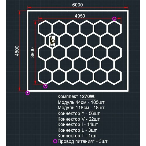Модульное LED освещение 4.8х6.0м 1270W/3000К тёплый оттенок Соты+прямоугольник AVstore. Светильник для детейлинга, автомойки, салона, гаража, коммерции, ресторана, барбершопа