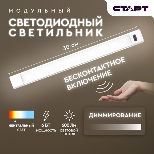 Светодиодный модульный светильник старт – инновационное решение для освещения любого помещения. Он обладает удобной функцией автоматического включения и выключения при движении руки рядом с датчиком на расстоянии 2-3 см от него. Это делает использование светильника удобным и интуитивно понятным. Лампы можно соединять между собой, что позволяет создавать длинные модульные системы, но не превышающие 2 метров. Благодаря этому светильник можно использовать для комнат разного размера. Важной особенностью устройства является возможность диммирования, то есть изменения яркости света. Это позволяет создать необходимую атмосферу в помещении и выбрать оптимальный уровень освещенности в зависимости от задачи. Мощность светильника старт составляет 6 Вт, а световой поток – 600 лм. Цветовая температура равна 4000 К, что обеспечивает комфортное и приятное освещение. Срок службы – 35 000 часов. Длина изделия – 300 мм. Комплектация включает в себя блок питания и крепежные элементы для двух вариантов установки – на двухсторонний скотч или металлические скобы.