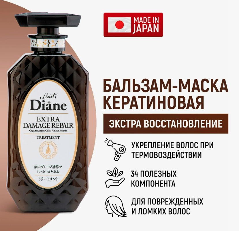 Японский кератиновый бальзам Moist Diane Perfect Beauty Extra Damage Repair разработан специально для ломких, поврежденных и ослабленных волос. Бальзам-маска эффективно восстанавливает повреждения волос изнутри, предотвращает ломкость и защищает от появления секущихся кончиков. Не содержит сульфатов. pH бальзам-маски: 3.5-5.5.