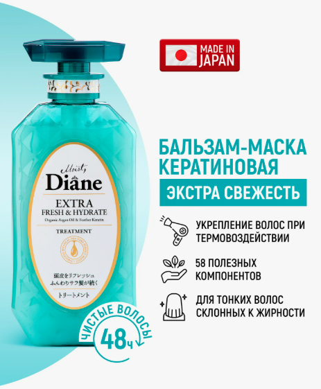 Бессиликоновый кератиновый набор для ежедневного ухода за волосами Moist Diane Fresh and Hydrate (Свежесть): Очищает жирную кожу головы; Увлажняет сухие кончики; Сохраняет свежесть волос до 48 часов; Сохраняет естественную увлажненность волос. ЧЕМ больше сушишь волосы, ТЕМ сильнее ОНИ становятся.
